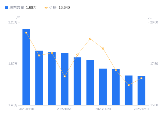 日期A股户数(户)流通A股户均持股数(股)户均持股市值(万元)2025-12-311683612500.1420.802025-12-201688512463.8720.222025-12-101750012025.8520.592025-11-201754611994.3222.112025-11-101836611458.8021.792025-10-311863711292.1820.392025-10-201905211046.2118.502025-10-101913610997.7219.982025-09-301928210914.4519.662025-09-10213859841.1219.08