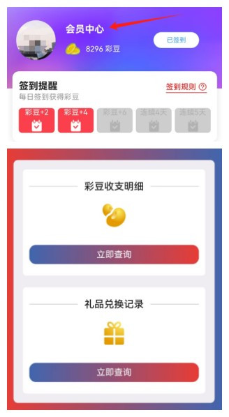 用户可在首页点击会员中心实时查看彩豆明细和礼品兑换记录。