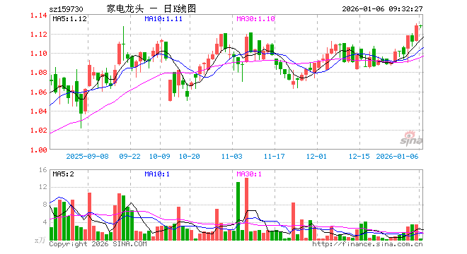 1月6日,龙头家电ETF(159730)开盘涨0.00%,报1.128元。龙头家电ETF(159730)重仓股方面,三花智控开盘跌0.52%,海尔智家涨0.15%,美的集团跌0.13%,格力电器涨0.02%,石头科技涨0.06%,德业股份涨0.01%,科沃斯涨0.13%,公牛集团涨0.15%,海信家电涨0.24%,老板电器涨0.05%。