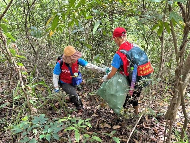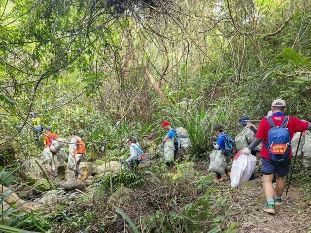 身背编织袋、手持垃圾夹,志愿者们在坡陡路滑的野径上一路攀登、一路俯身。有时,他们需手脚并用,才能将散落在陡坡或树丛中的瓶罐、包装清理出来,再一步步运至山下。那抹流动在山林间的“志愿红”,成为了山野间最温暖、最坚韧的风景。截至目前,行动累计开展12场,参与志愿者76人次,服务总时长超过600小时,共清理出各类遗留垃圾约800公斤。除了“爱心线”,阳台山森林公园志愿服务队的守护脚步延伸至鲲鹏径全程。