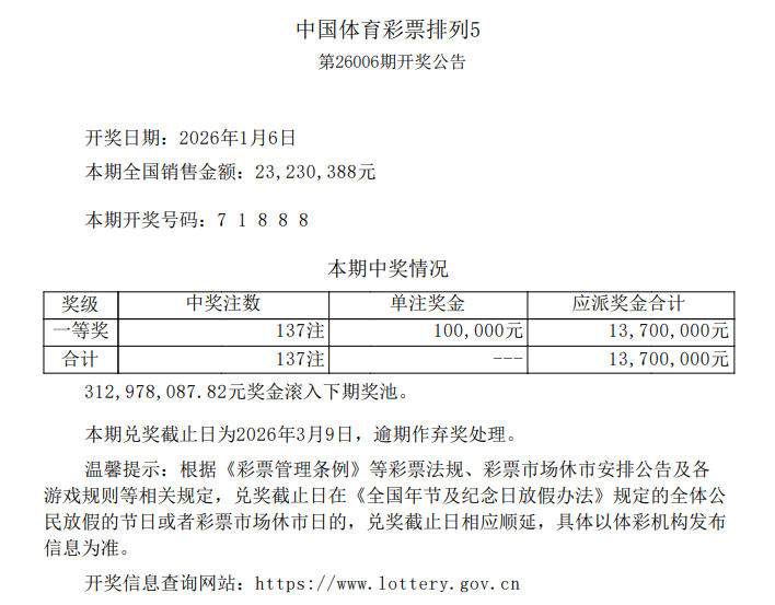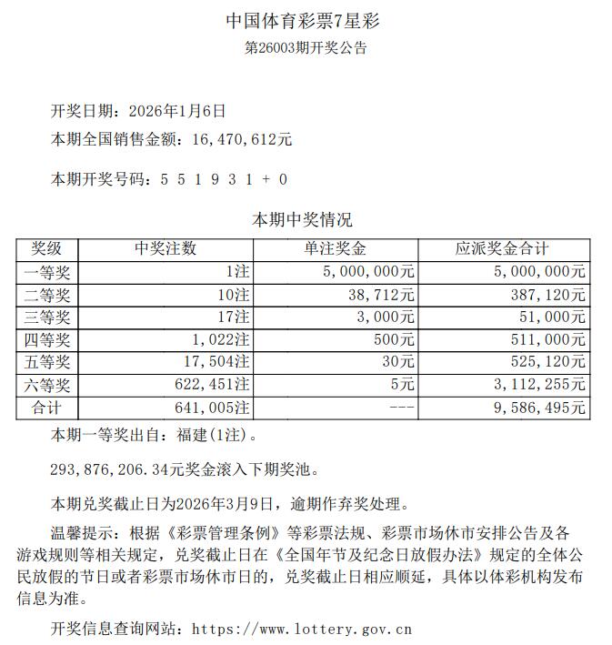1月6日体彩中奖号码 7星彩开出1注500万大奖