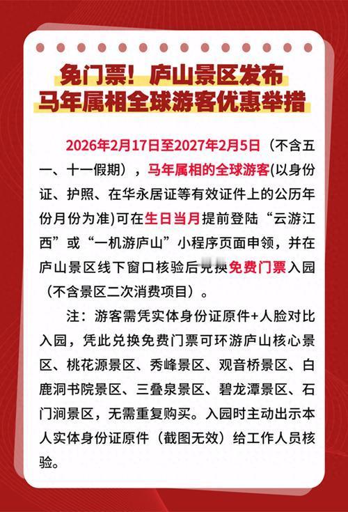 2026马年还没到,全国景区已经卷起来送福利啦!属马的、姓马的,甚至名字里带“马”字的朋友,直接解锁免票特权~ 河南伏羲山、新疆赛里木湖、陕西太白山这些热门景区都在列,有的免票到3月,陕西太白山更是全年免票(法定节假日除外)。湖北大洪山连名字同音“马”都认,山东十笏园还送星级酒店折扣,福利超实在。 记得带本人身份证现场核验,大多免首道门票,二次消费自理哈。这波宠粉太走心,符合条件的别浪费好机会,赶紧约上朋友错峰冲! 你身边有“马系”朋友吗?评论区喊他来薅羊毛~