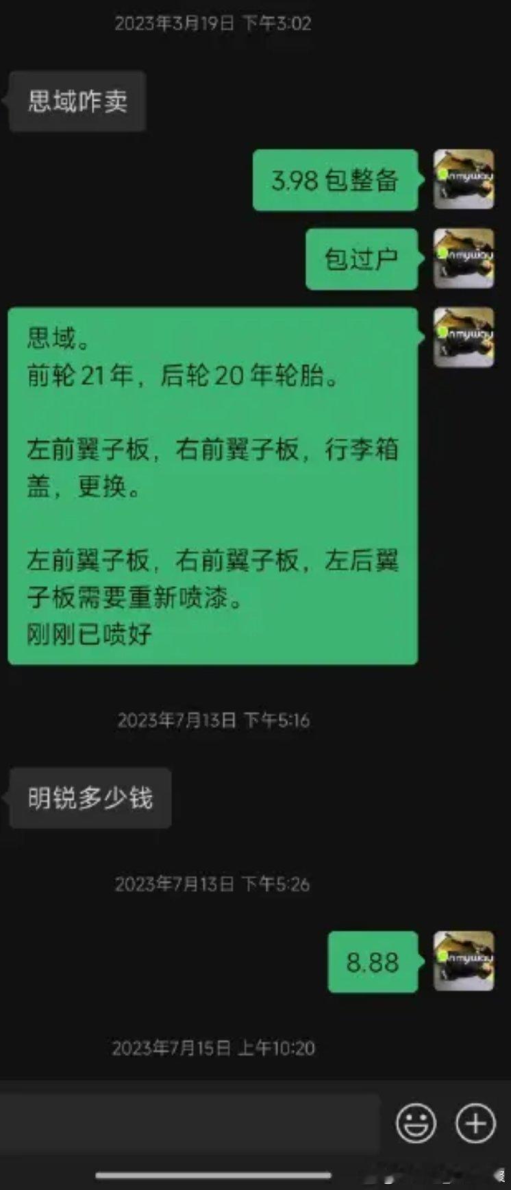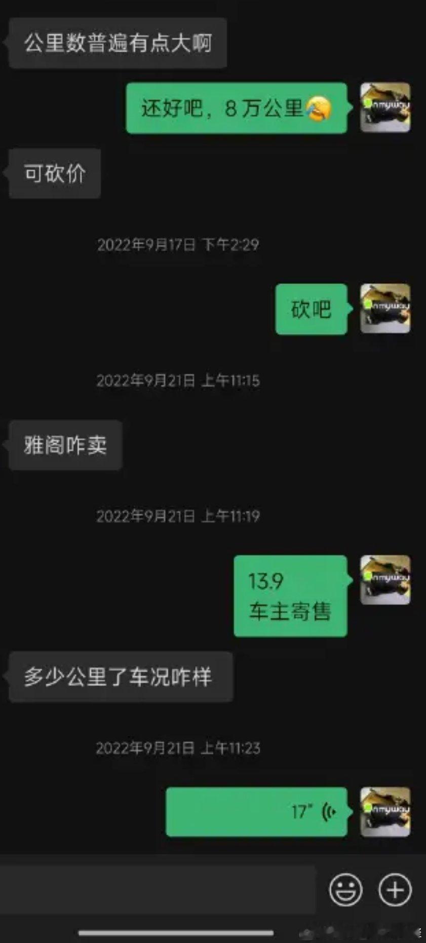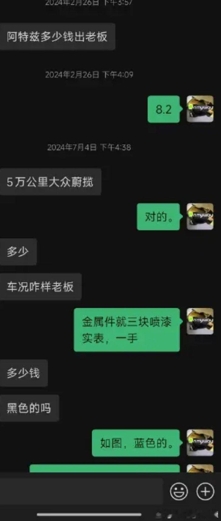 马力玩聚老马在路上 分享一个2022年9月加的车友没有恶意反正不是实名我就不打码遮挡名字了挺有意思的问价-消失砍价-消失哈哈哈我相信每个车商vx里都有这样的客户! (为了不上升到个人,我还是截图只体现沟通内容)