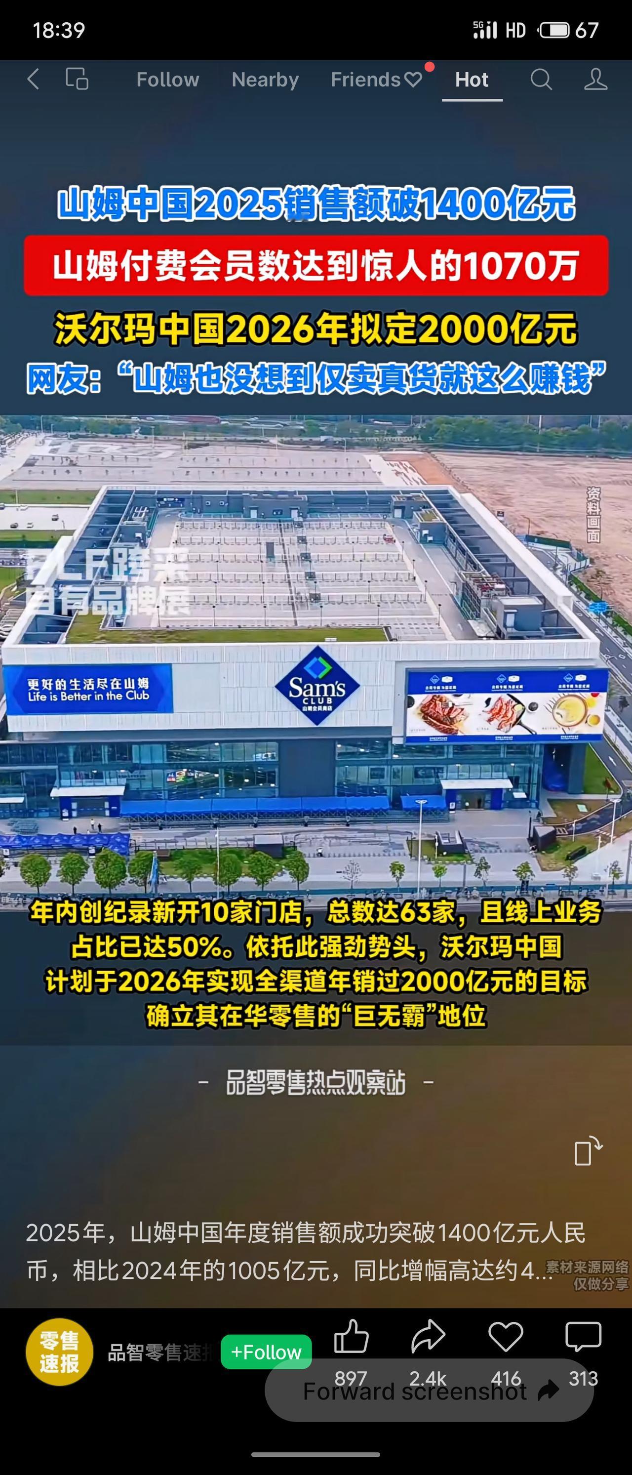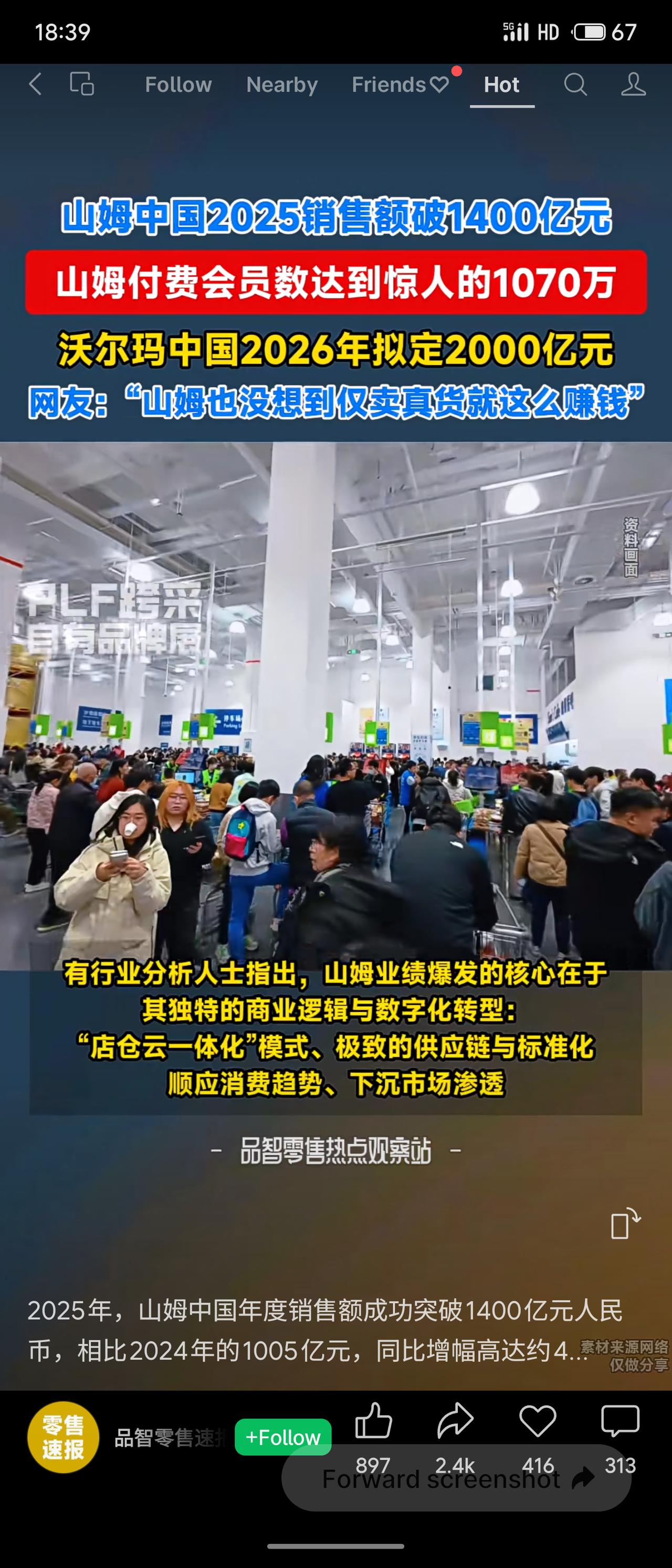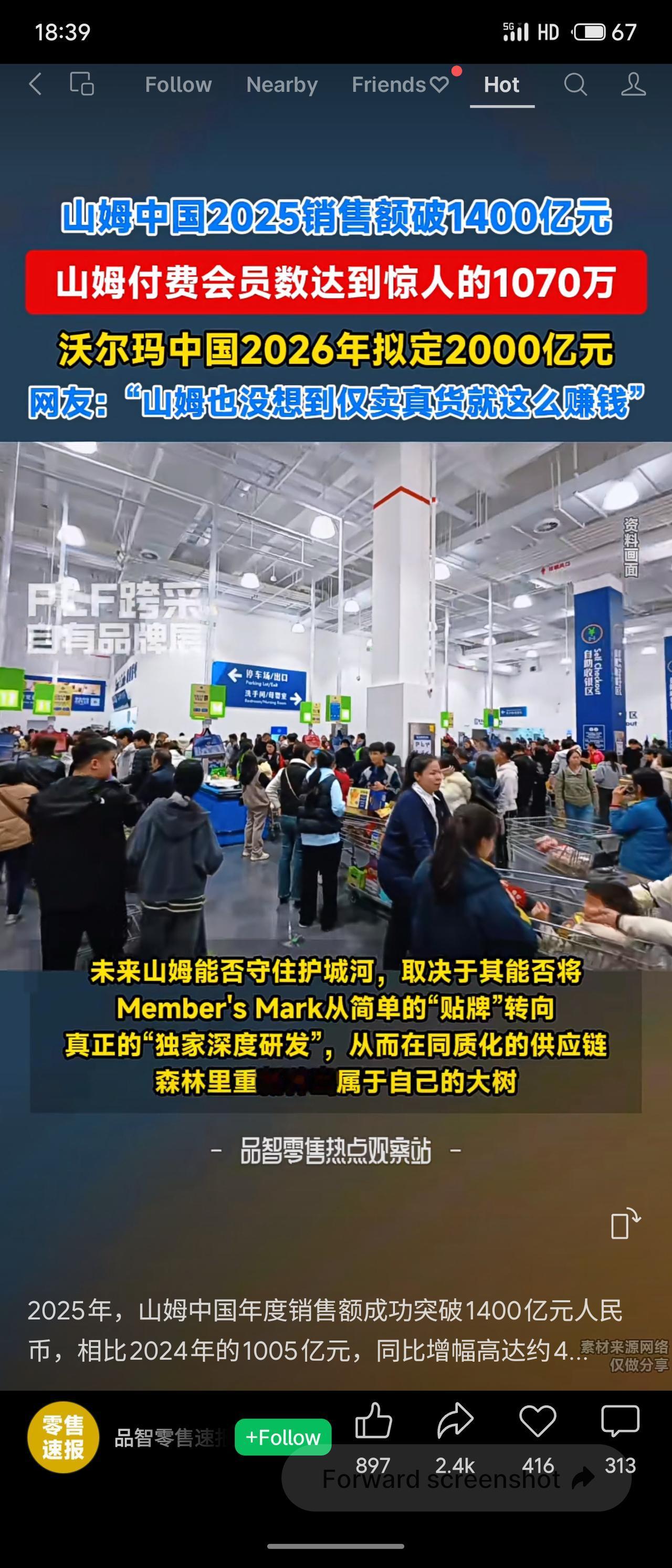 2025年,山姆中国销售额突破1400亿元,同比增约40%,付费会员达1070万,人均年消费1.31万元。其成功得益于“店仓云一体”模式、强大供应链及下沉市场拓展。沃尔玛中国更计划2026年冲击2000亿元全渠道目标。 山姆凭借会员制与差异化商品构筑了深厚护城河,业绩亮眼。但规模快速扩张也对其持续创新与维持会员价值提出考验,未来需从供应链效率转向真正的独家研发能力。
