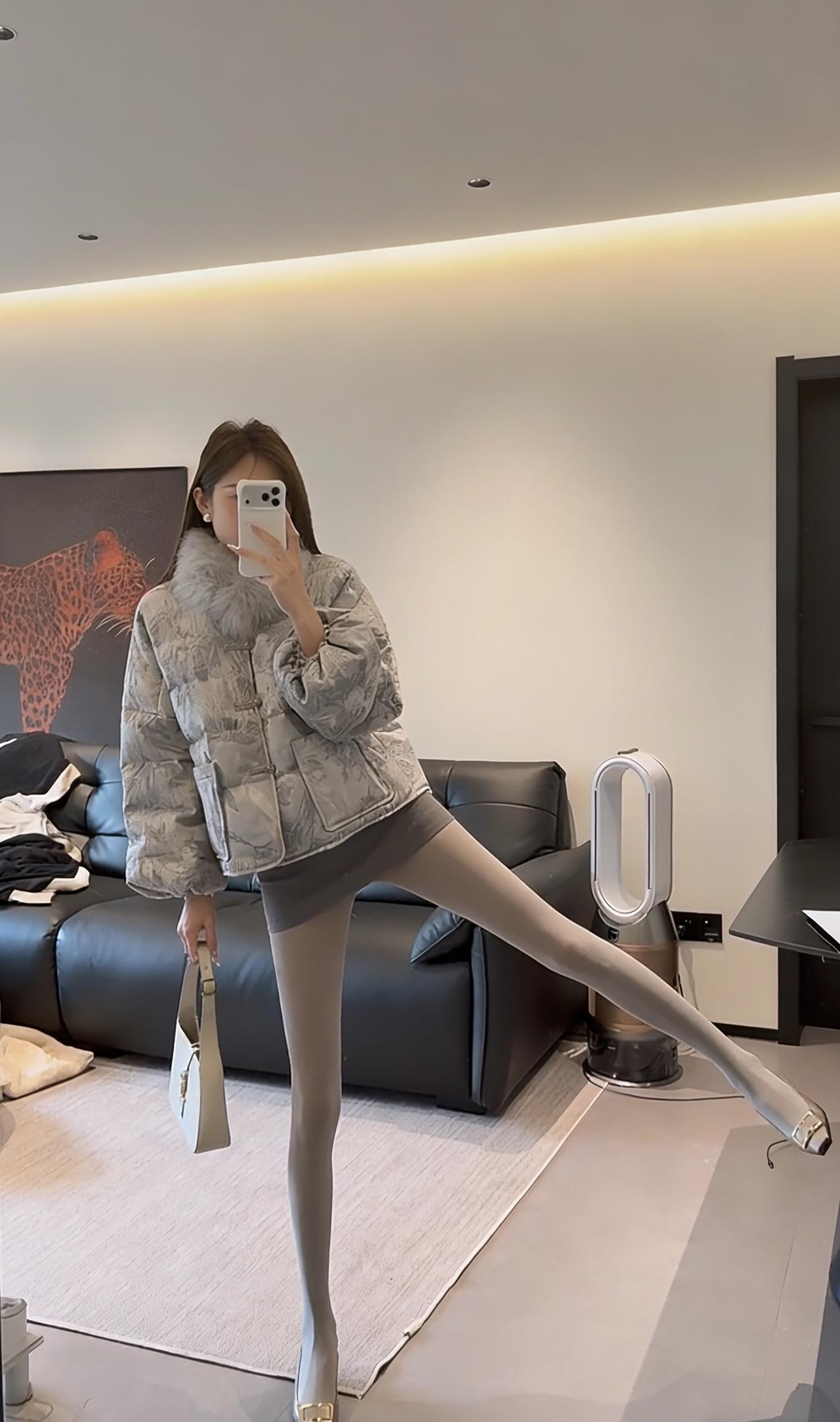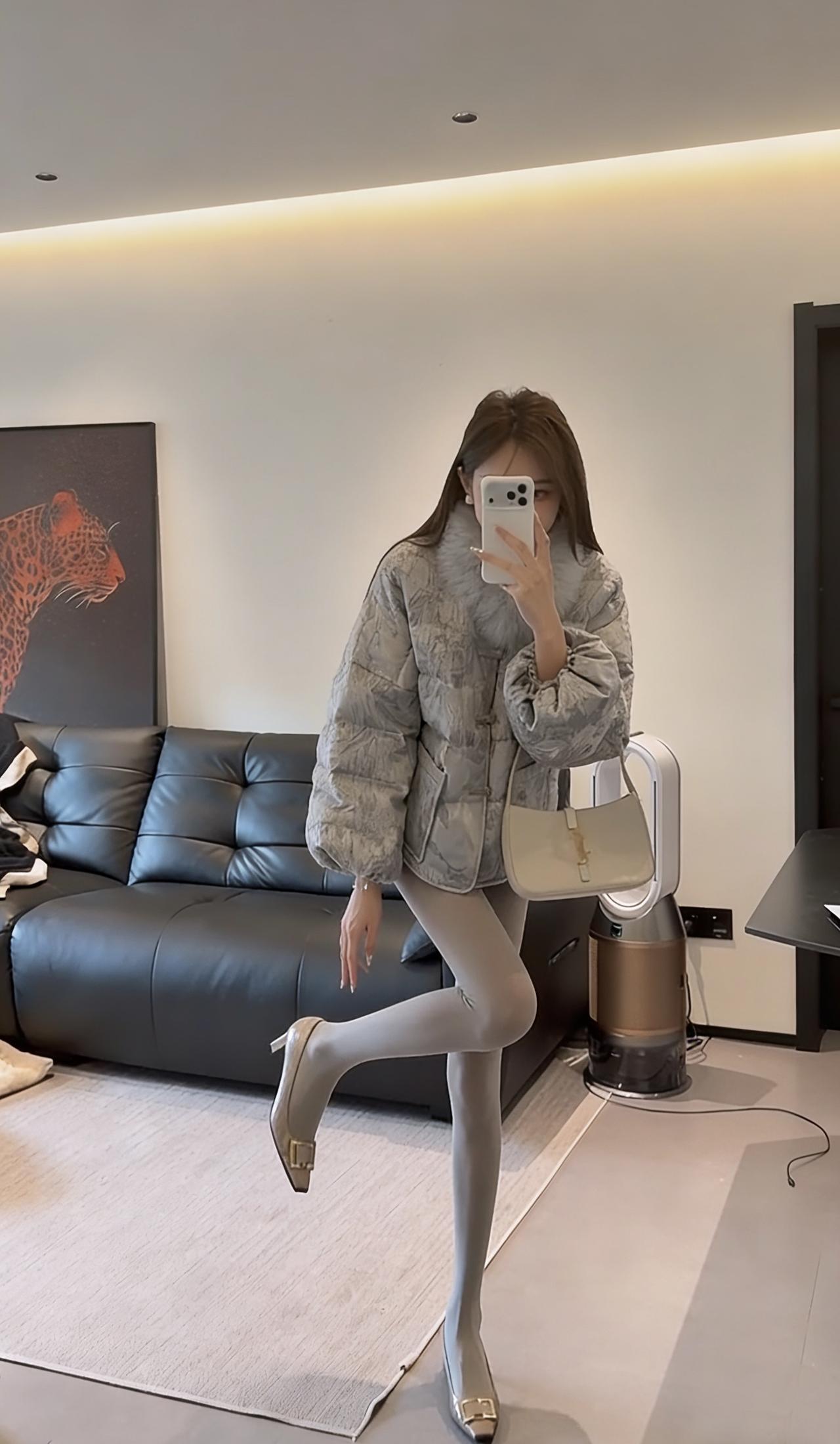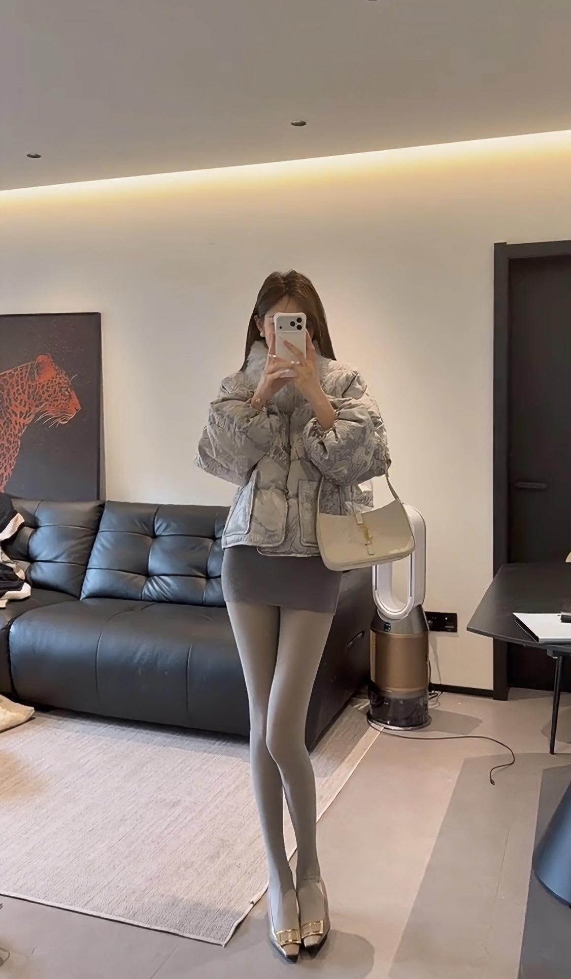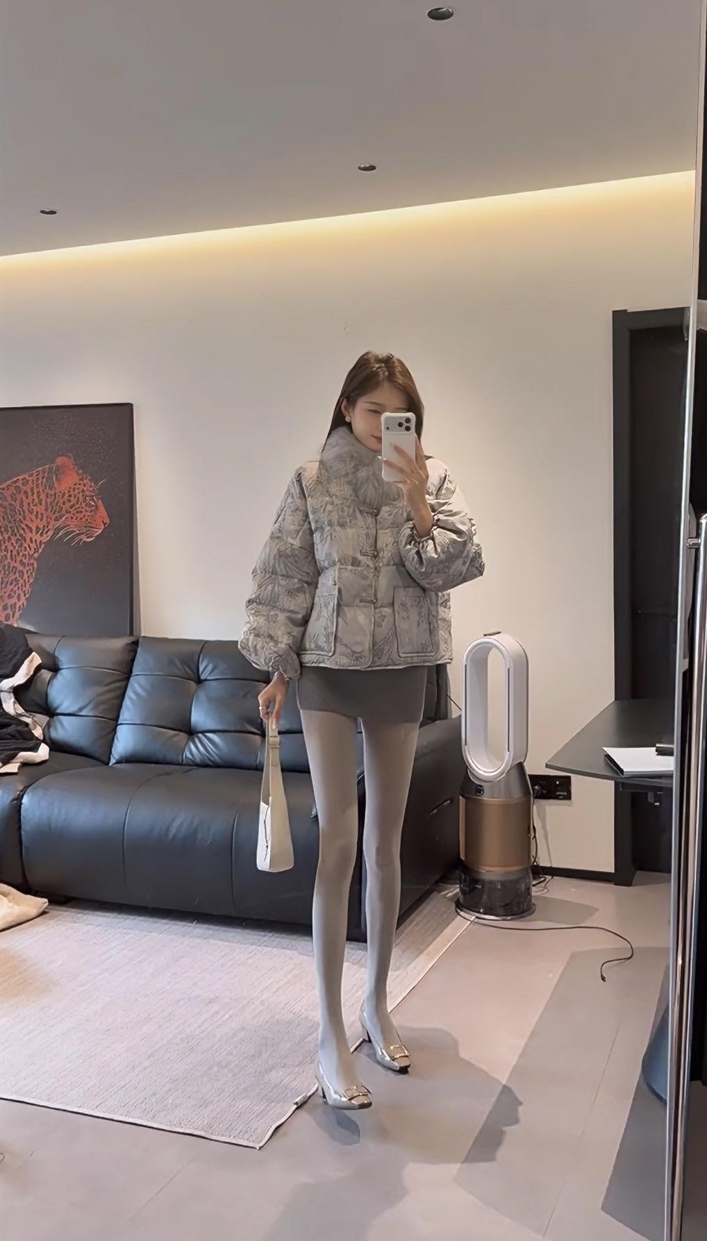 这套穿搭走轻熟名媛风,以上下深浅灰的同色系搭配打造高级层次感: • 上衣:浅灰色提花短款羽绒服,带毛领设计增加精致感与保暖性,短款版型拉高腰线,弱化羽绒服的臃肿感; • 下装:深灰色紧身包臀短裙+同色系光腿神器,勾勒腿部线条,柔化羽绒服的厚重感,形成“上宽下紧”的视觉平衡; • 鞋履:金属方头细高跟,提升整体精致度与气场,与浅灰羽绒服的质感相呼应; • 配饰:简约的浅色手提包,点缀造型的同时保持风格统一。 适合场合 1. 轻奢社交场合:如闺蜜下午茶、小众餐厅约会、轻奢品牌线下活动,既保暖又能体现精致穿搭品味; 2. 日常通勤(轻职场):适合时尚行业、创意类工作的日常办公,兼顾温度与造型感,不会过于随意; 3. 节日休闲聚会:如圣诞、新年的小型朋友聚会,穿搭吸睛又不会显得浮夸,适配室内外切换的场景。