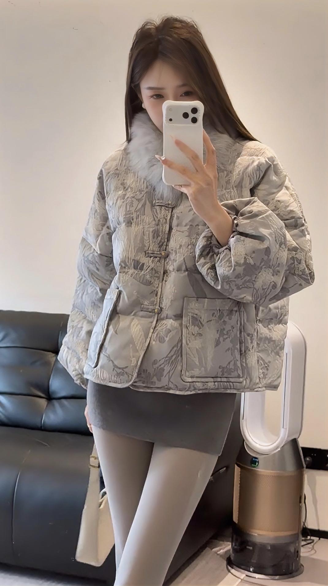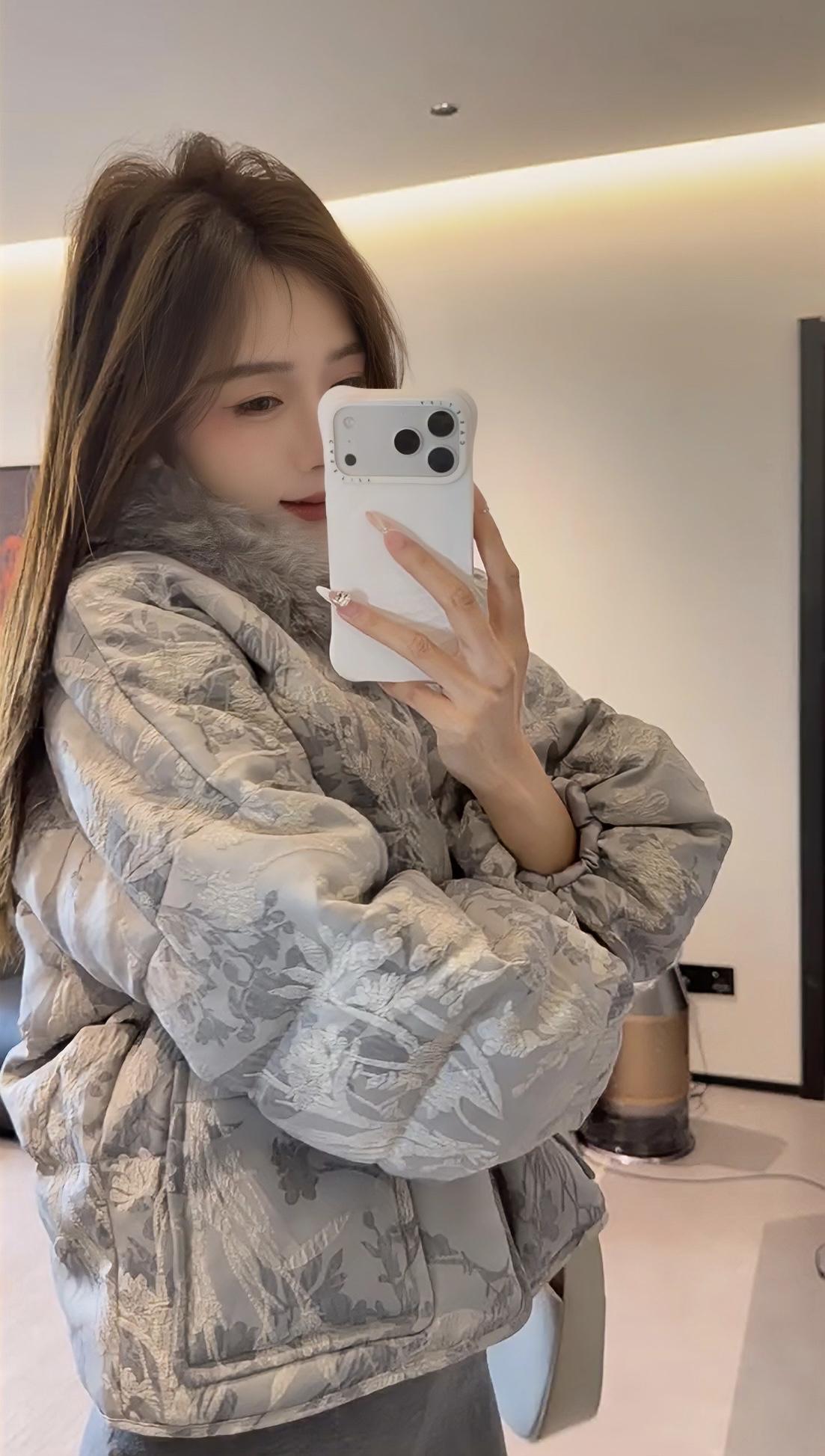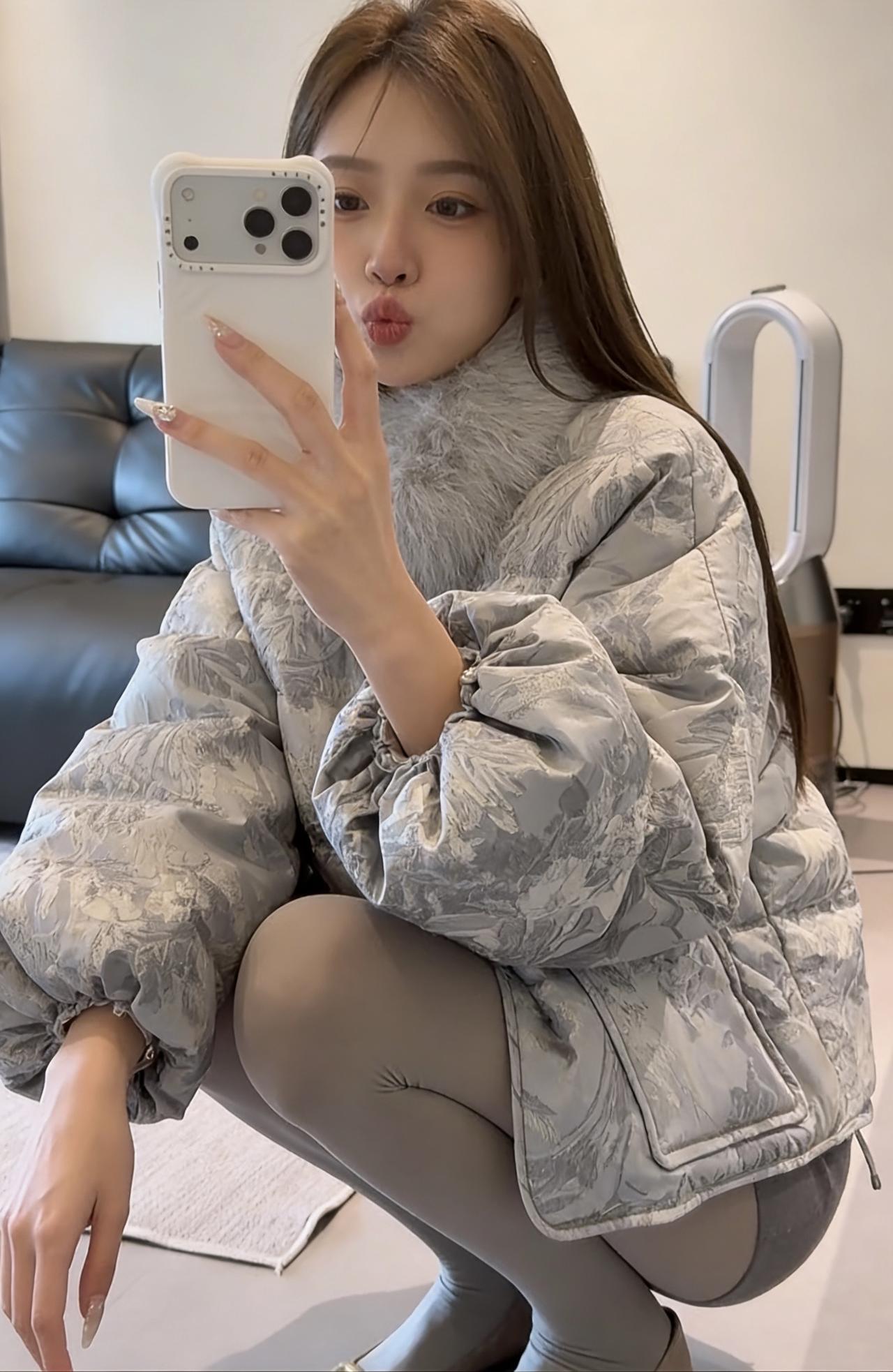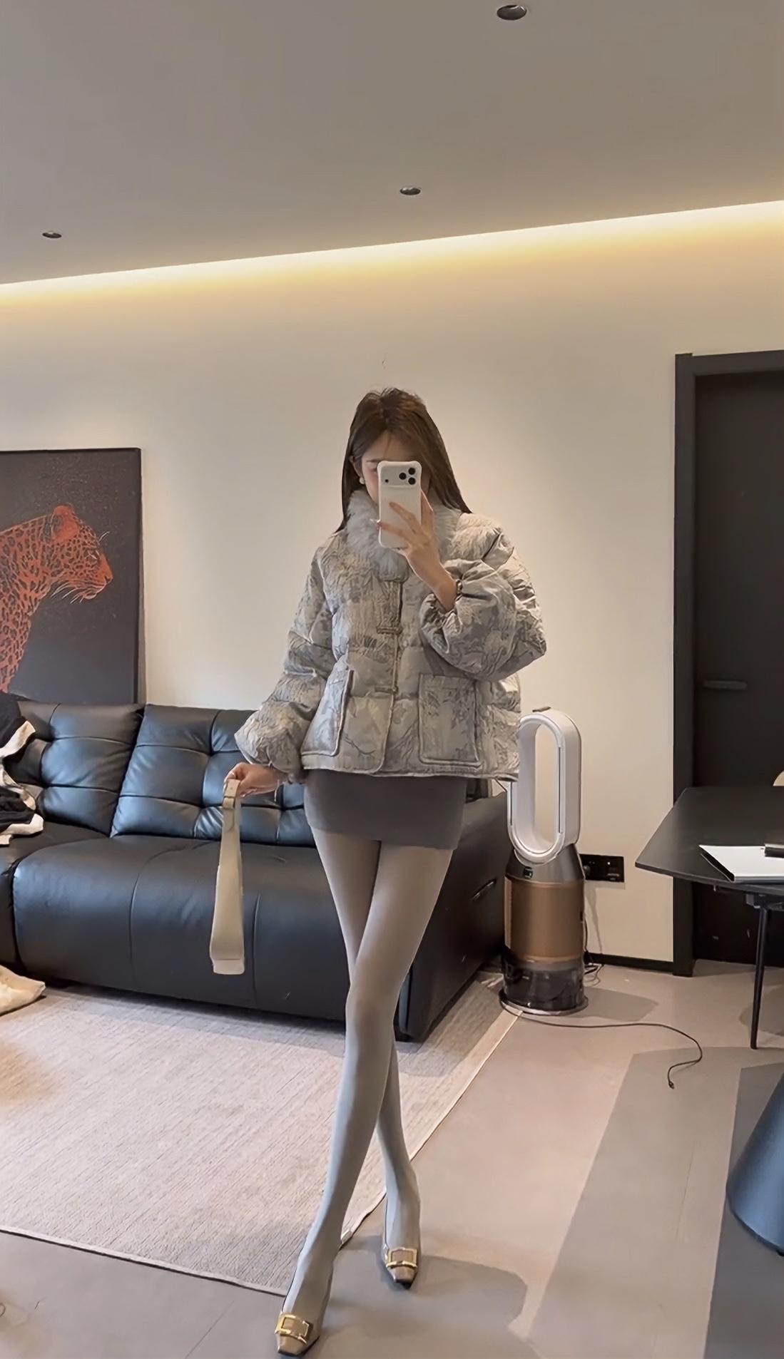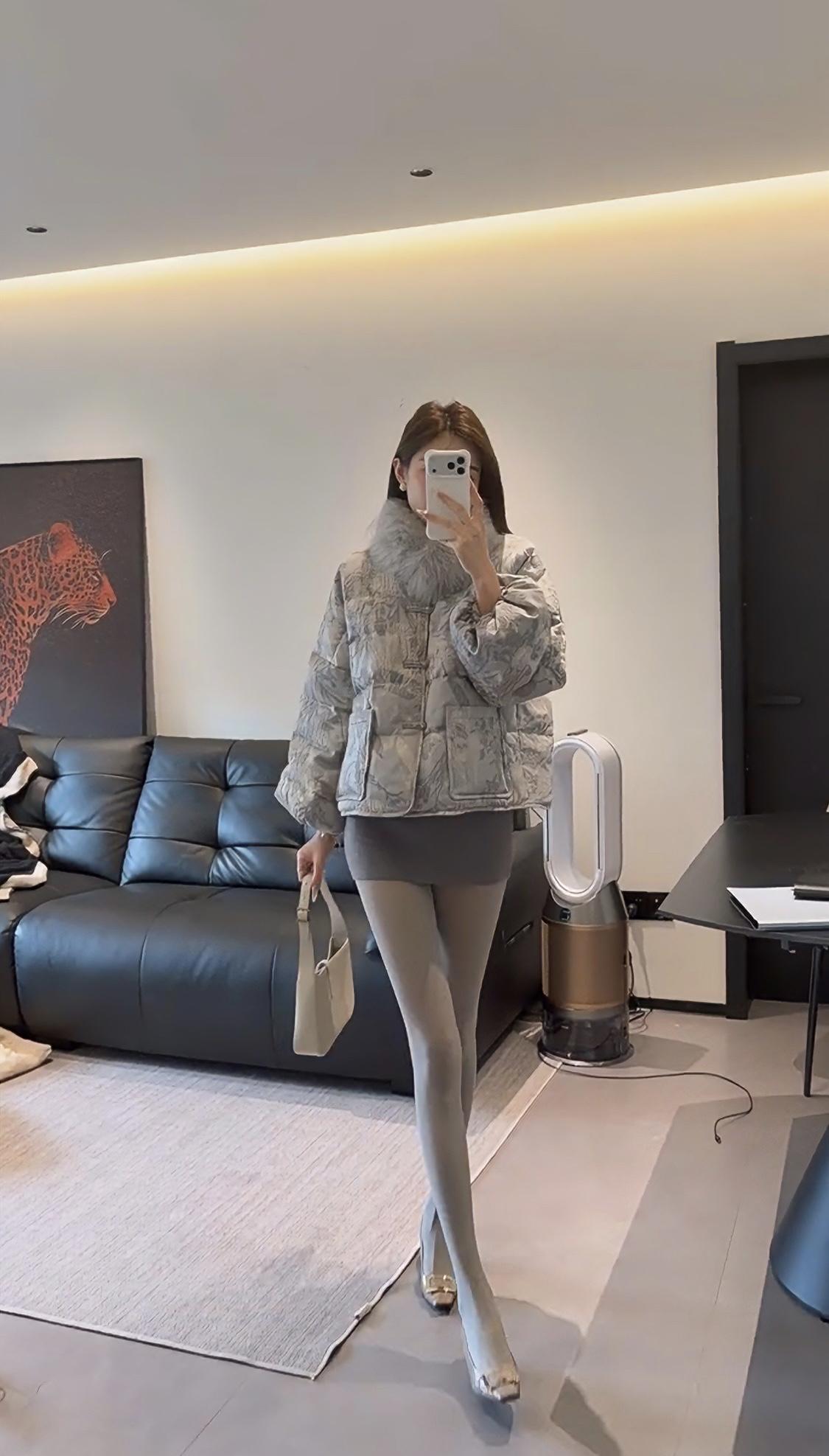 这套穿搭走轻熟名媛风,以上下深浅灰的同色系搭配打造高级层次感: • 上衣:浅灰色提花短款羽绒服,带毛领设计增加精致感与保暖性,短款版型拉高腰线,弱化羽绒服的臃肿感; • 下装:深灰色紧身包臀短裙+同色系光腿神器,勾勒腿部线条,柔化羽绒服的厚重感,形成“上宽下紧”的视觉平衡; • 鞋履:金属方头细高跟,提升整体精致度与气场,与浅灰羽绒服的质感相呼应; • 配饰:简约的浅色手提包,点缀造型的同时保持风格统一。 适合场合 1. 轻奢社交场合:如闺蜜下午茶、小众餐厅约会、轻奢品牌线下活动,既保暖又能体现精致穿搭品味; 2. 日常通勤(轻职场):适合时尚行业、创意类工作的日常办公,兼顾温度与造型感,不会过于随意; 3. 节日休闲聚会:如圣诞、新年的小型朋友聚会,穿搭吸睛又不会显得浮夸,适配室内外切换的场景。