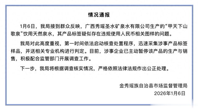 1月6日,我局接到群众反映,广西秀瑶圣水矿泉水有限公司生产的“甲天下山歌泉”饮用天然泉水,其产品标签疑似存在违规使用人民币相关图样的问题。
