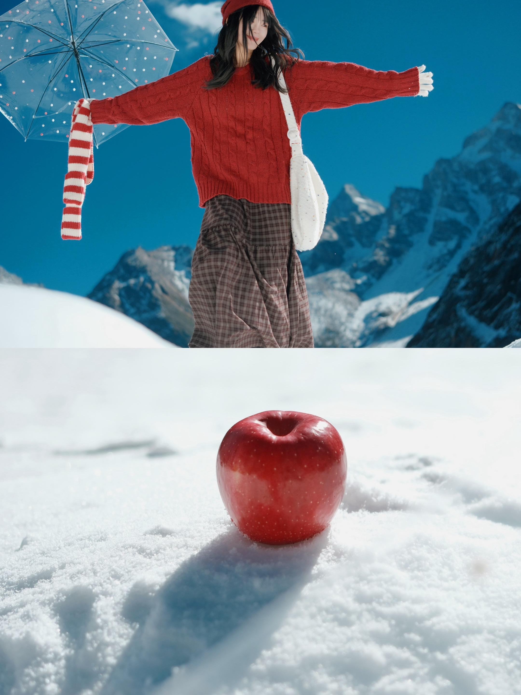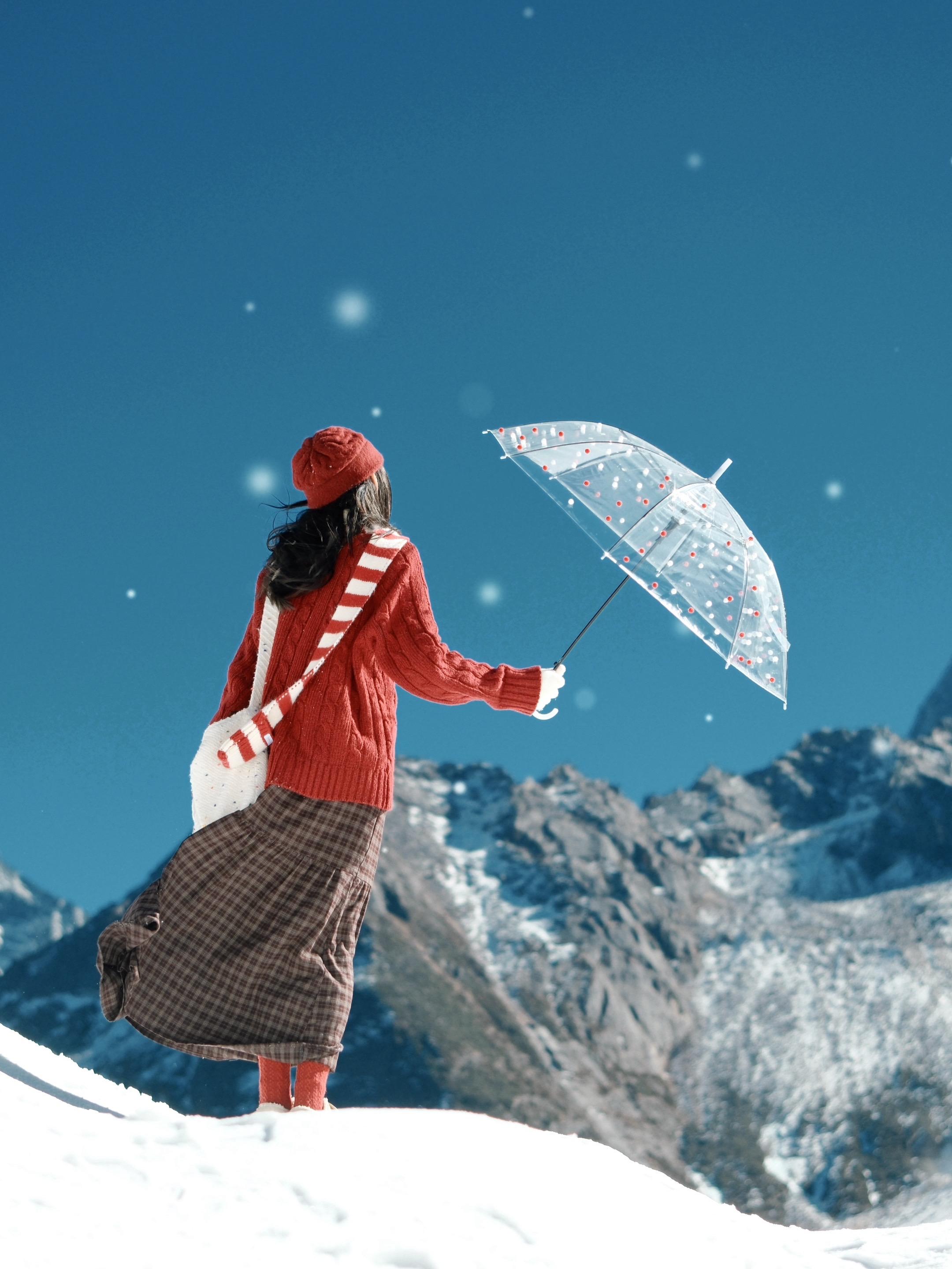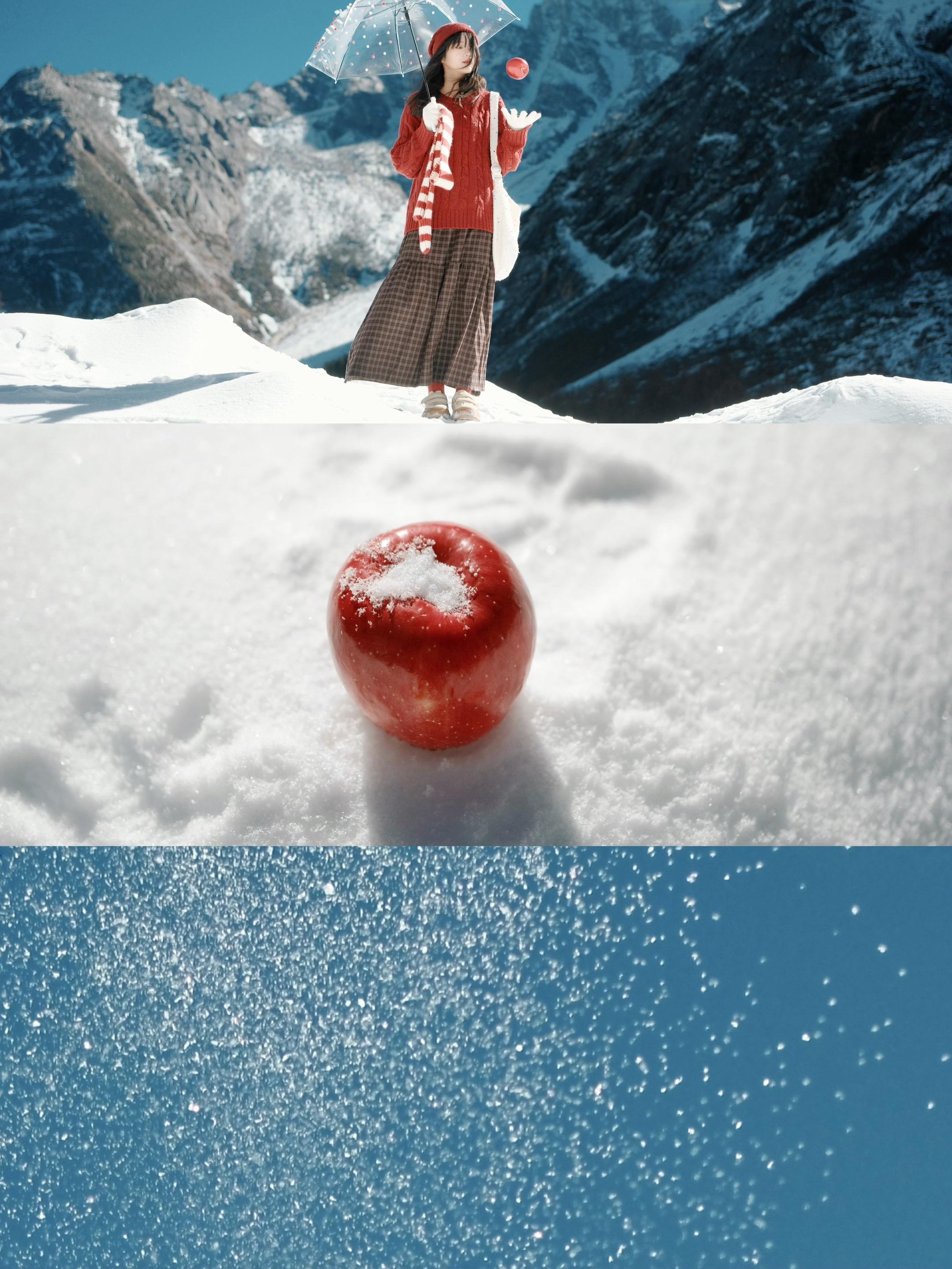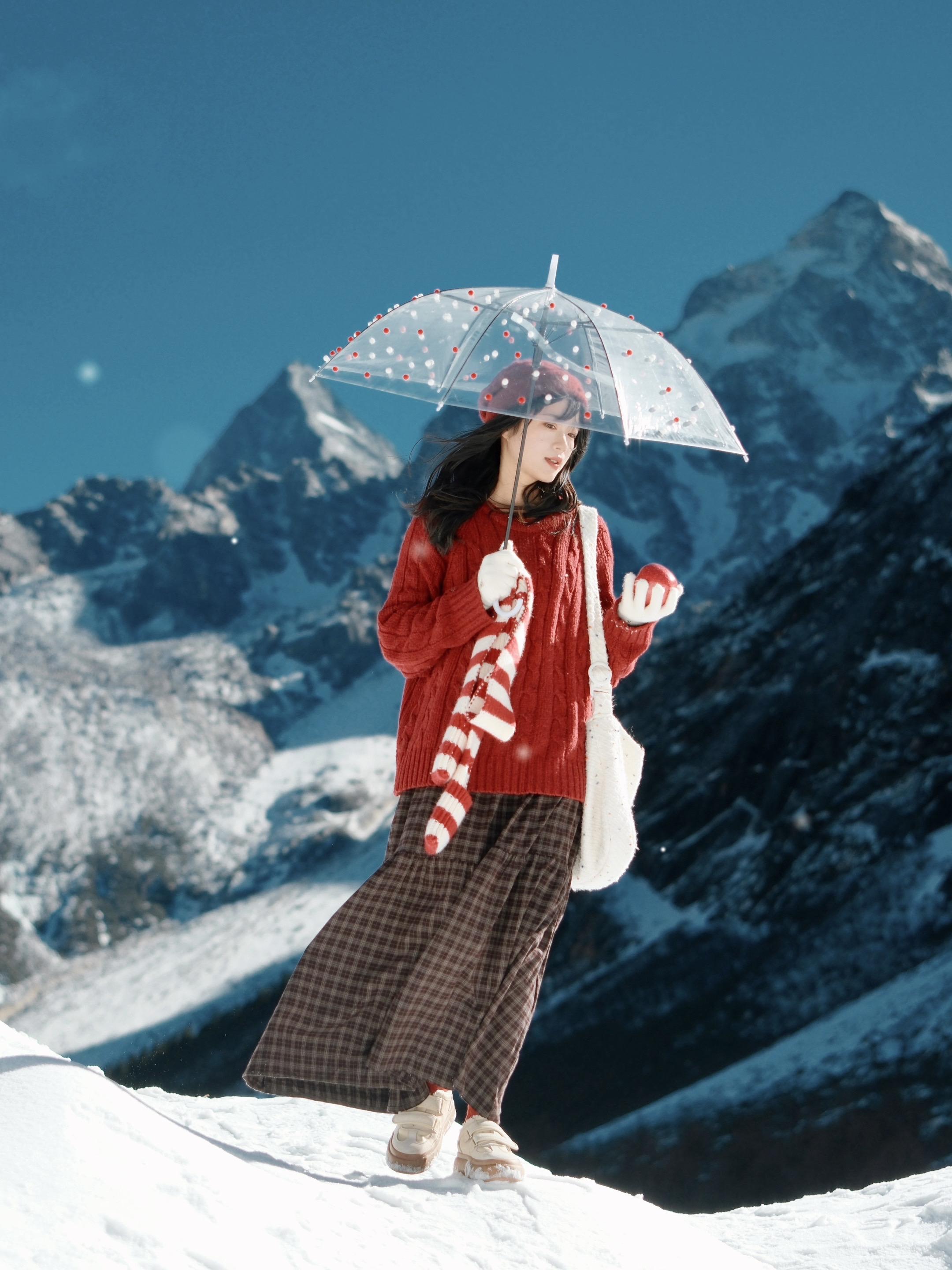 雪山下的新年红❤️📷文艺氛围感。雪山治愈一切 明媚的阳光,湛蓝的天空 雪地成为天然反光板
