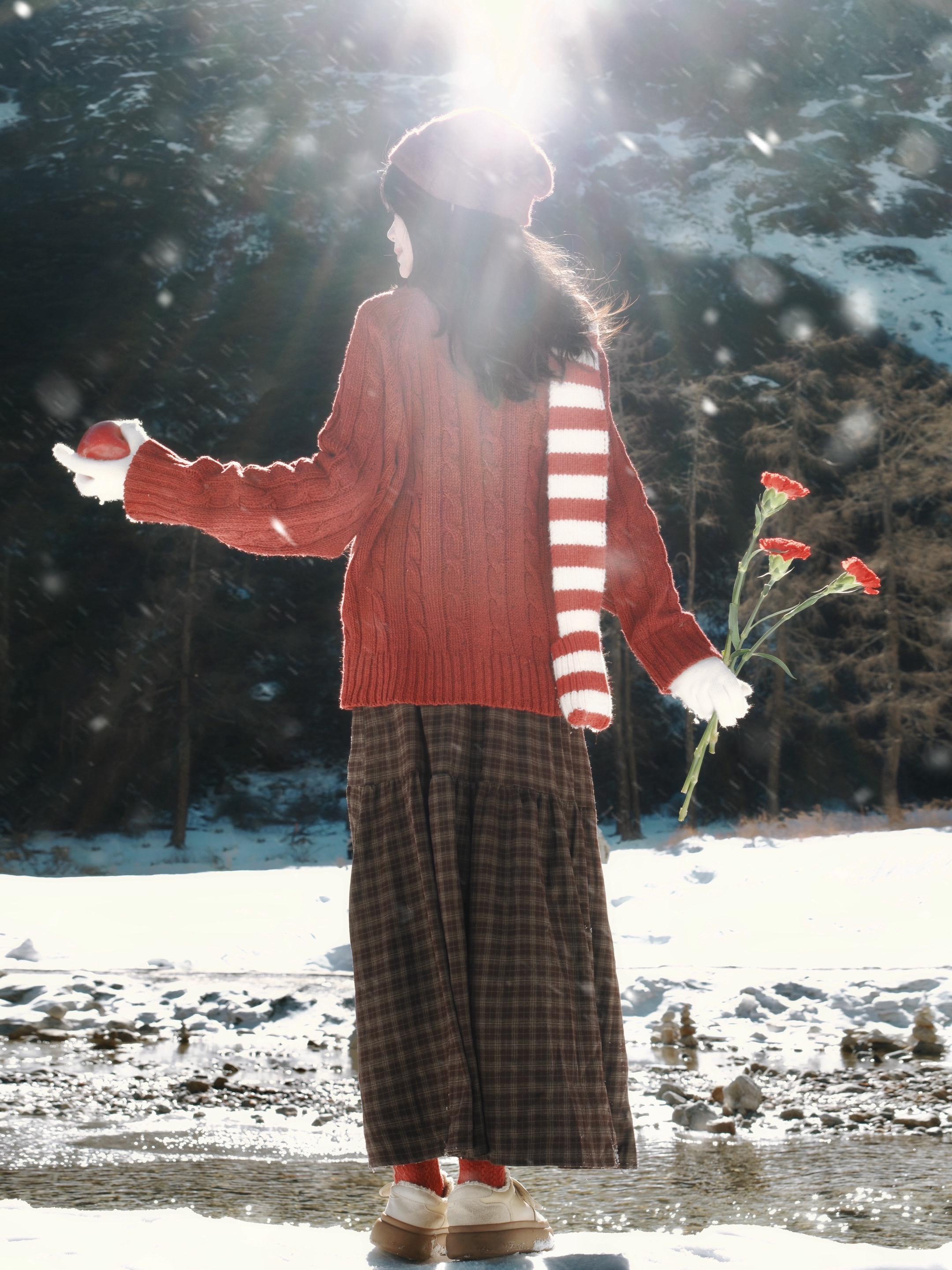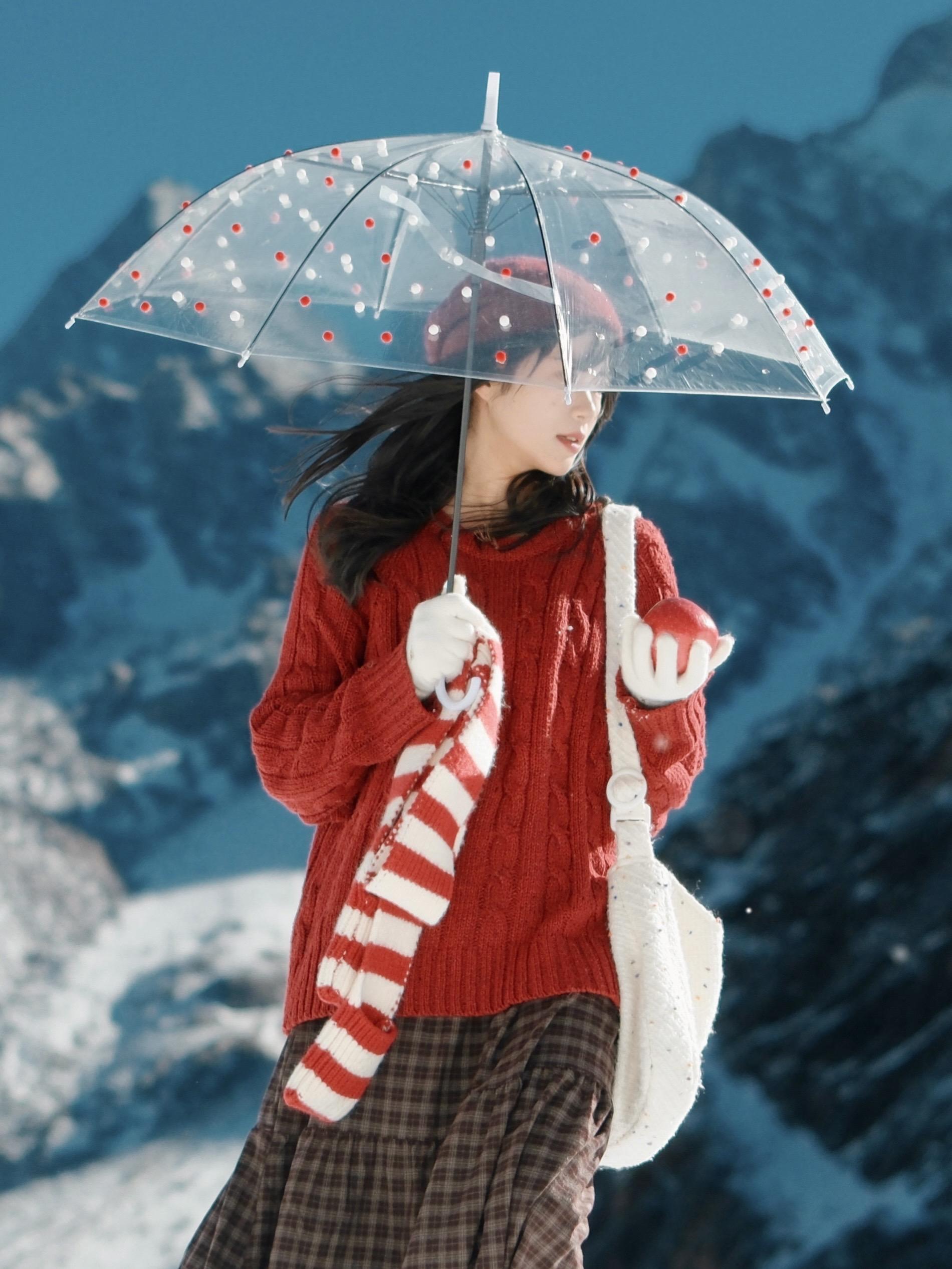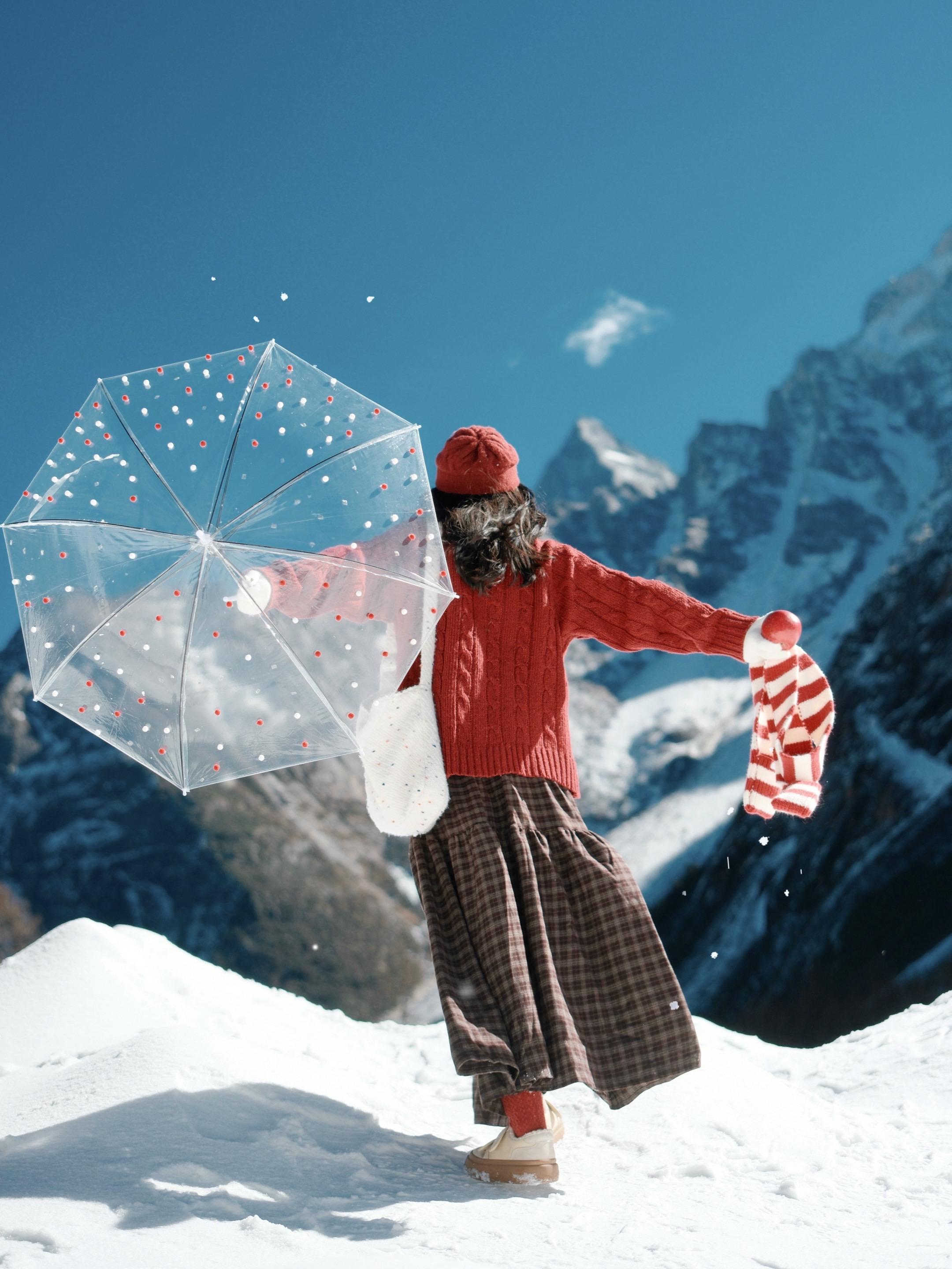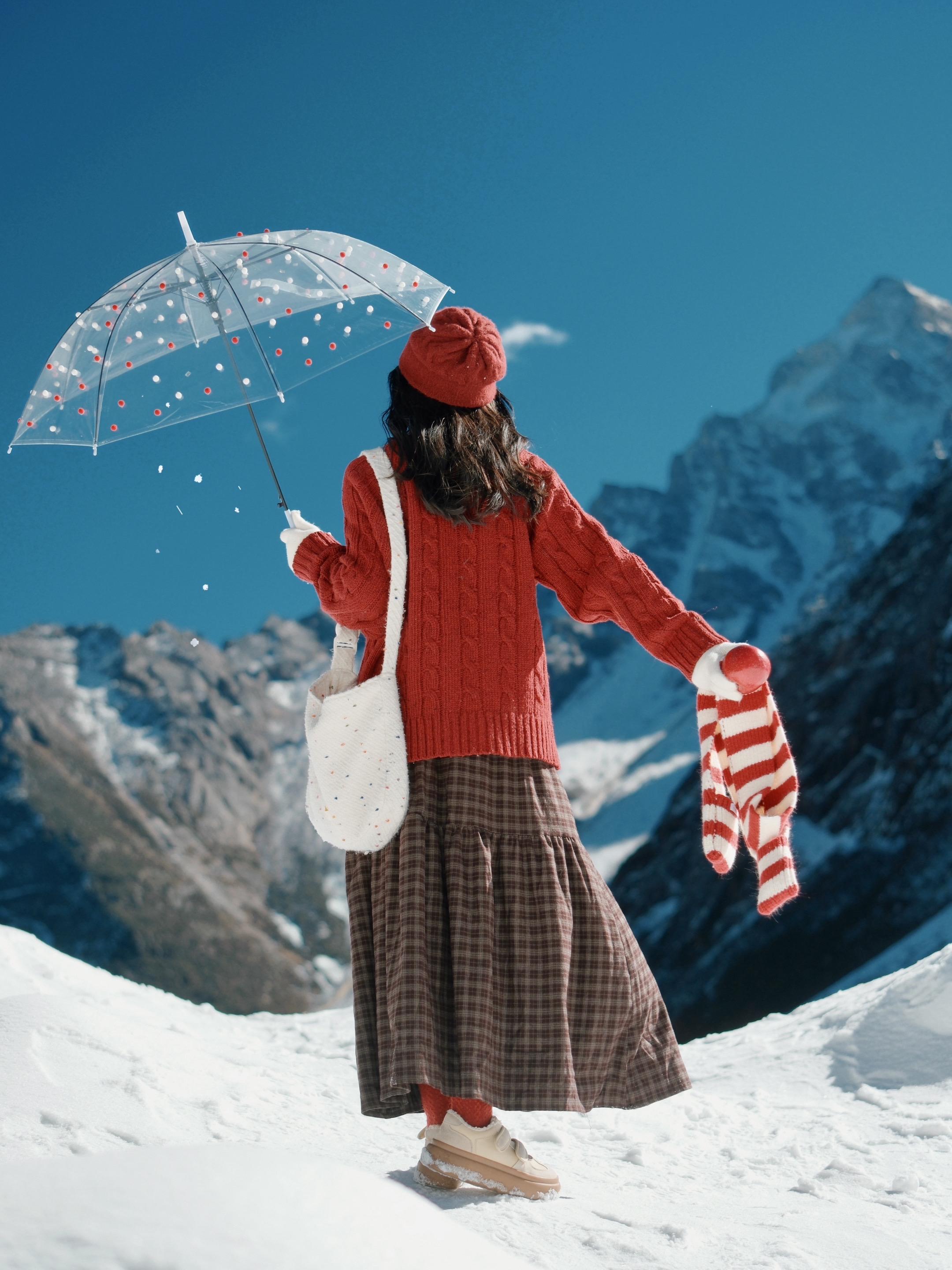 雪山下的新年红❤️📷文艺氛围感。雪山治愈一切 明媚的阳光,湛蓝的天空 雪地成为天然反光板