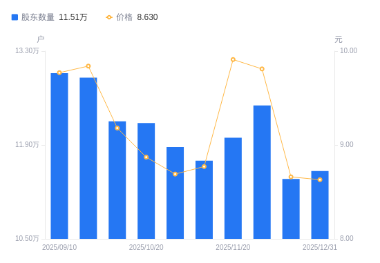 日期A股户数(户)流通A股户均持股数(股)户均持股市值(万元)2025-12-201139224970.204.302025-11-281248824534.004.452025-11-201200824715.244.672025-11-101166494854.014.262025-10-311186854770.744.152025-10-201222634631.134.112025-09-301225324620.964.242025-09-191290474387.674.322025-09-101296944365.784.272025-08-201207544689.004.50