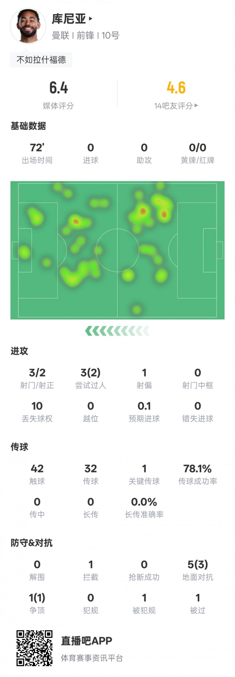 直播吧1月8日讯2025-26赛季英超联赛第21轮,曼联客战伯恩利。库尼亚首发出战,3次射门2次射正,3次过人2次成功,送出1次关键传球,评分6.4。