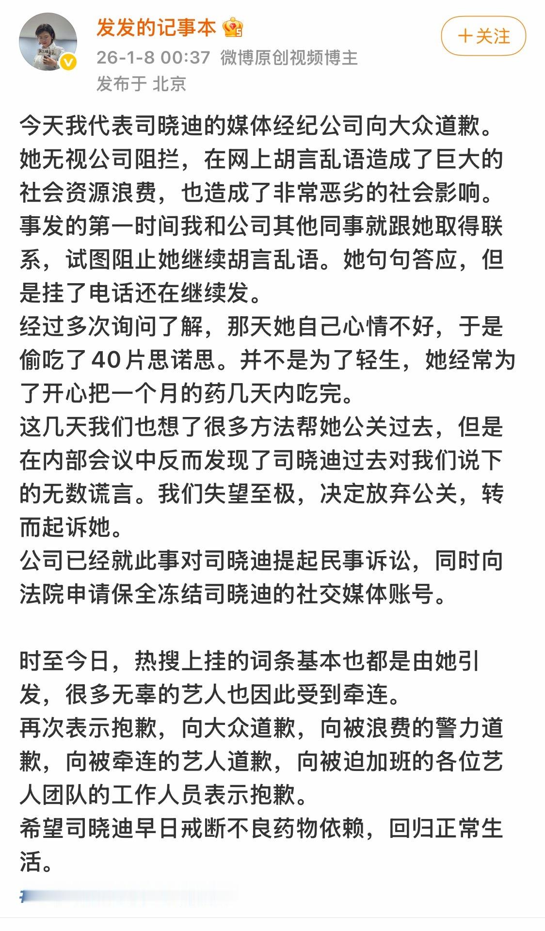 王大发起诉司晓迪这个“思诺思”是什么药啊?💊一次吃40片不用席位洗胃的吗而且说司晓迪是王大发的艺人…她都有什么演艺事业吗?好像从来没看到过现在好了,明星还没起诉她,老板先把她起诉了