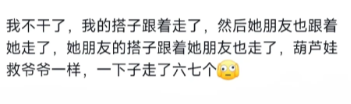 我不干了,我的搭子跟着走了,然后她朋友也跟着她走了,她朋友的搭子跟着她朋友也走了,葫芦娃救爷爷一样,一下子走了六七个