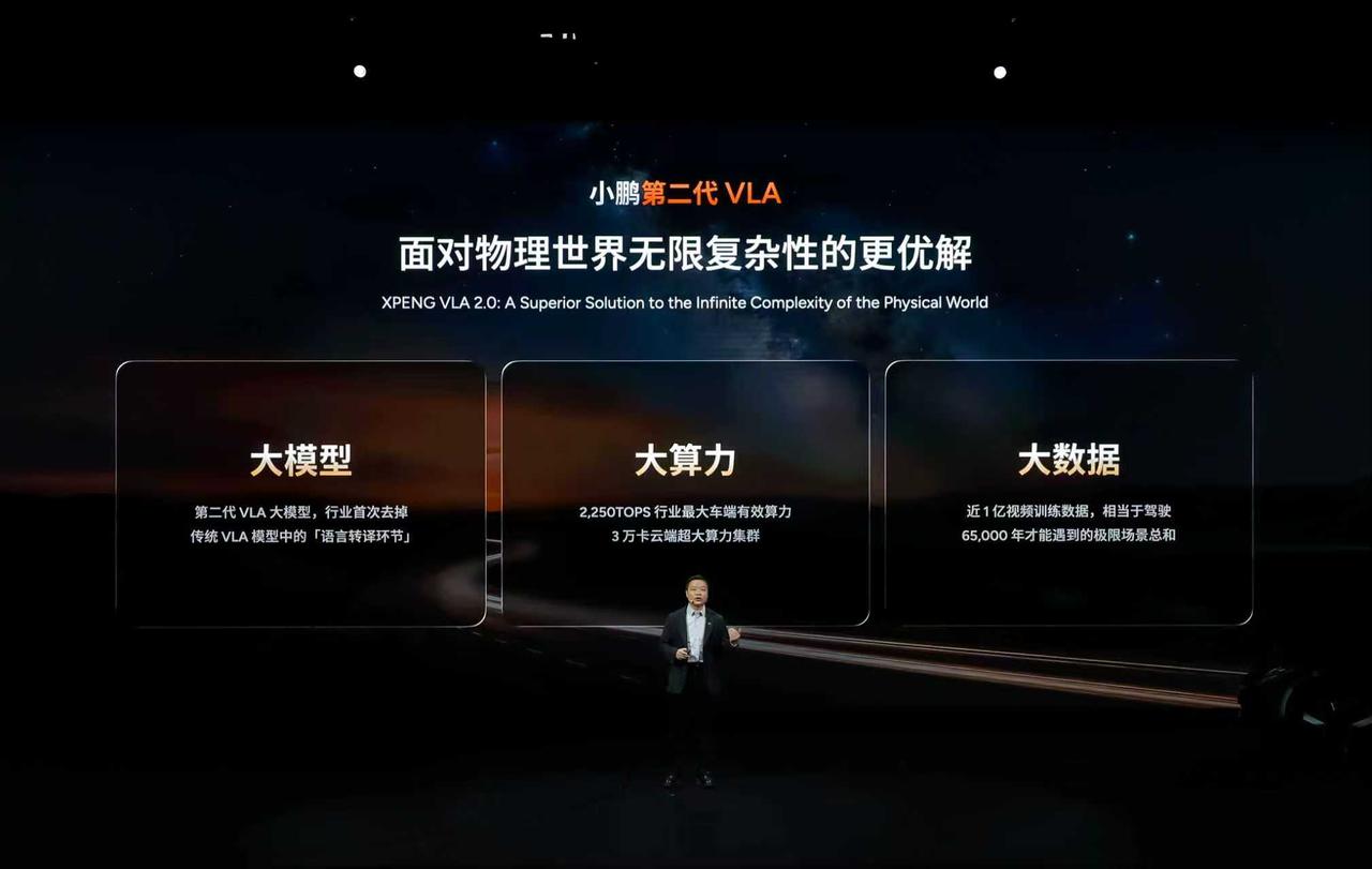 小鹏第二代VLA是面对物理世界无限复杂性的更优解。L2与L4的四大核心差异在于能力、场景、安心、效率,在大模型+大算力+大数据三点共同作用下,小鹏第二代VLA将快速地带来接近L4的智驾体验。 - 大模型:第二代VLA大模型行业首次去掉传统VLA模型中的「语言转译环节」 - 大算力:2,250TOPS 行业最大车端有效算力、3万卡云端超大算力集群 - 大数据:近1亿视频训练数据,相当于驾驶65,000年才能遇到的极限场景总和 小鹏新年四车齐发
