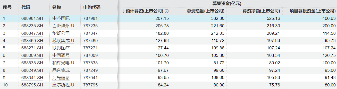 若长鑫科技最终实际募资金额未远超计划金额,则其实际募资额则可能位列科创板历史第二位。