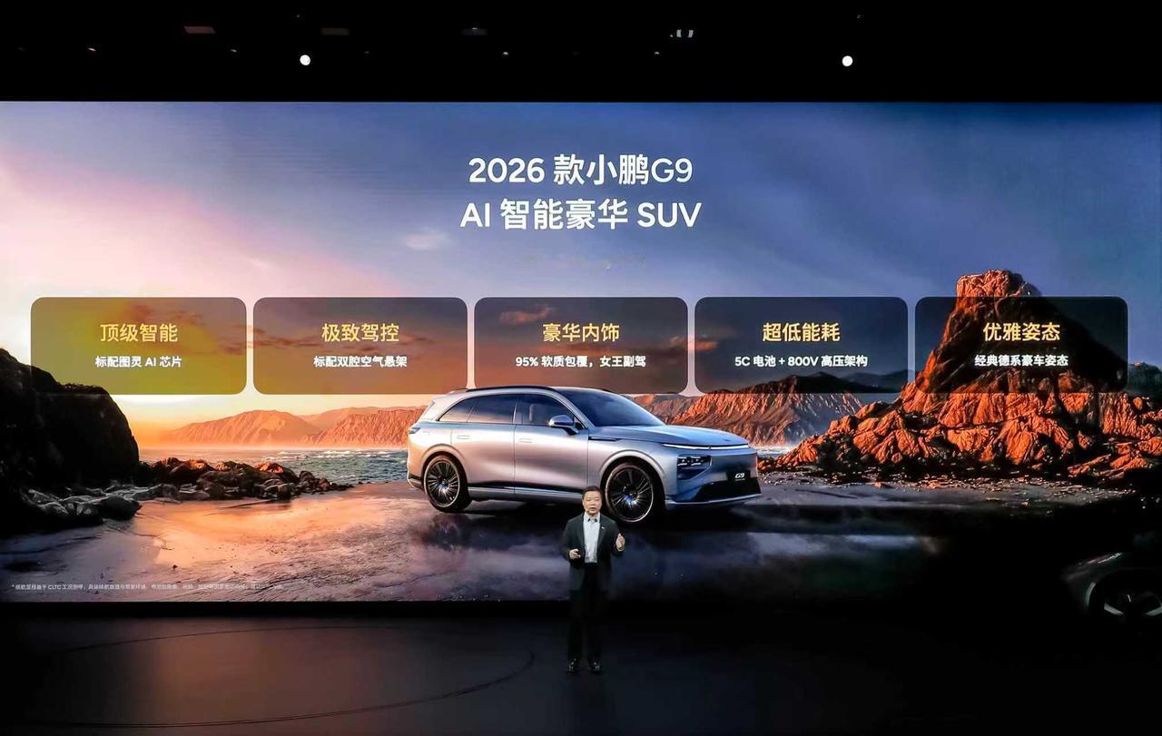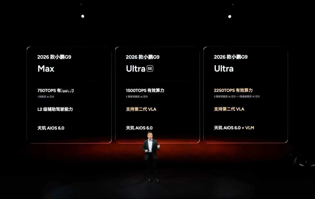 小鹏G9作为欧洲中大型纯电SUV销量榜唯一入围的中国车,在意大利、德国等汽车工业强国也曾斩获过细分市场销量第一。 「AI智能豪华SUV」2026款小鹏G9焕“芯”升级,图灵AI芯片上车,智能进阶三大版本满足: - Max 版搭载 1 颗图灵 AI 芯片,提供 750 TOPS 算力,标配全场景智驾能力; - 增设Ultra SE 版,算力翻倍到 1500 TOPS,可以体验小鹏第二代VLA; - Ultra版拥有2250 TOPS 的顶格算力,完整支持VLM大模型。 新色新月银,哑光车漆质感,月光骑士升级套装。标配百万级双腔空悬+豪华内饰,在驾控高级感与触手可及的舒适性上,让顶级智能与旗舰豪华成为可靠可感的日常。