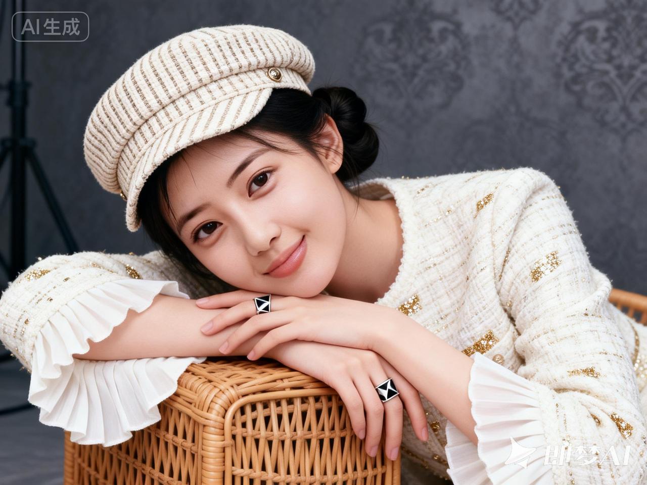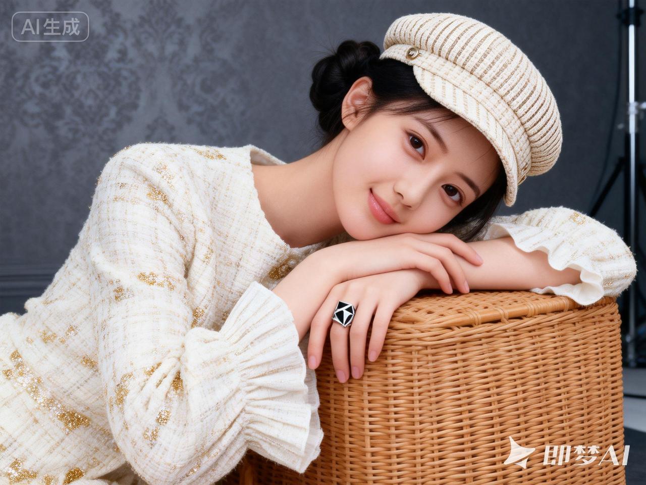 甜美少女风,温柔笑容,复古毛衣与贝雷帽的完美搭配,尽显优雅气质。
