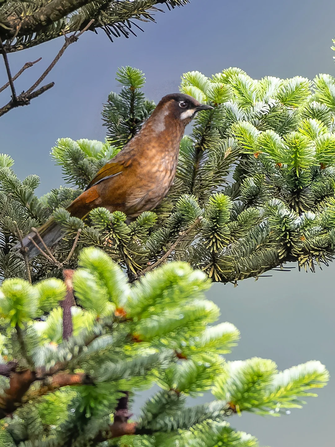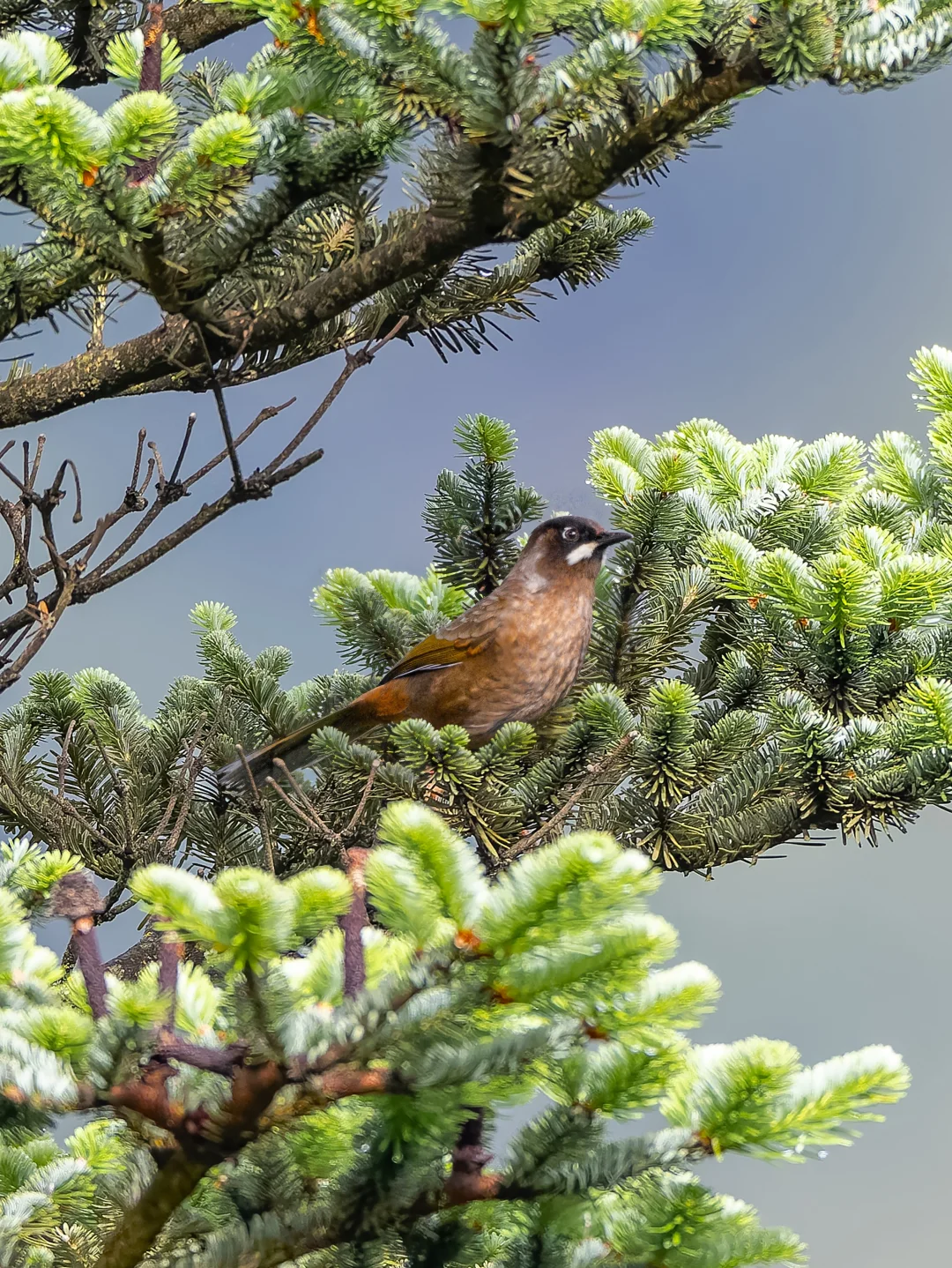 原创拍摄于2025.07 黑顶噪鹛,Black-faced Laughingthrush,雀形目噪鹛科彩翼噪鹛属。是一种分布在我国四川云南及喜马拉雅地区海拔2千米以上的一种高山噪鹛。 黑顶噪鹛头部是黑白的图案,有一个白胡子的样子,翅膀和尾巴有一些金色,其余都是橄榄棕色。 这只在轿子山看到的黑顶噪鹛爬到了一棵高高的云杉上鸣叫,这个云杉看上去太有传统中国画的风格了。