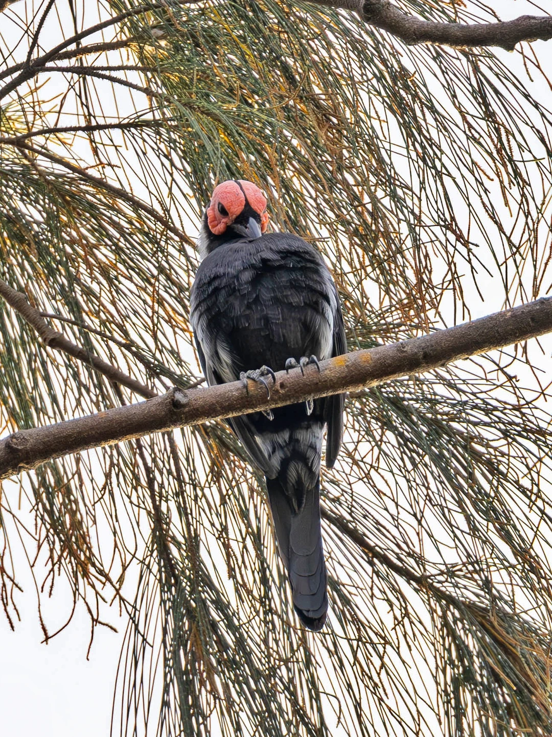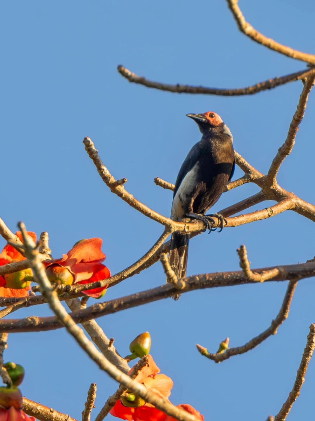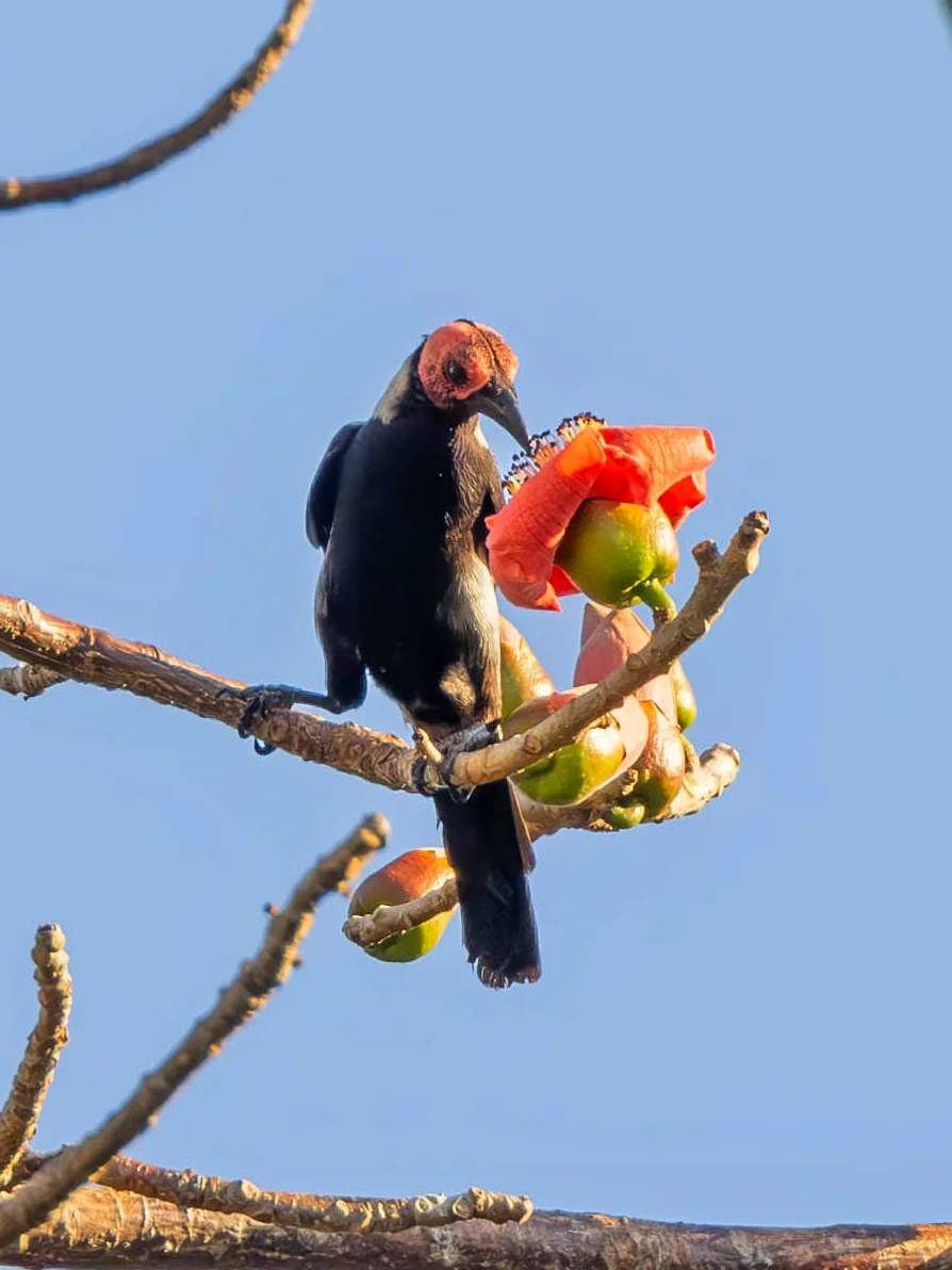 这种鸟非常的特别,它们头部没有毛,而裸露的皮肤呈现粉红色,覆盖了大部分的脸部和颈部的侧面,和全身黑灰色的羽毛(带蓝绿色光泽)形成鲜明的对比。这一只秃椋鸟,看上去很喜欢吸食木棉花的花蜜,采花大盗是也。