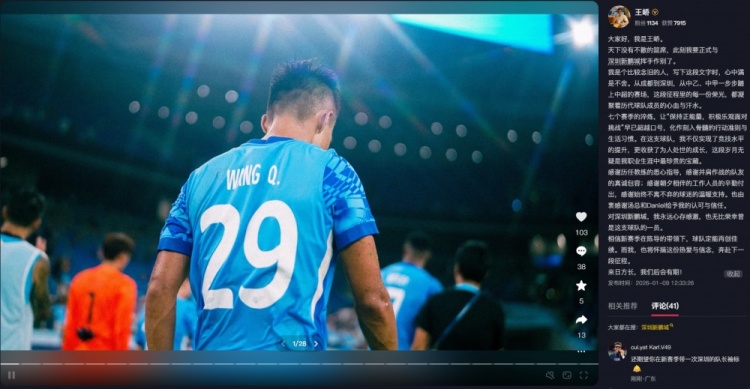 直播吧1月9日讯此前深圳新鹏城俱乐部官方宣布,球员王峤合约期满后离队。通过个人短视频账号,王峤向深圳新鹏城正式告别,并为球队的未来送上祝福。