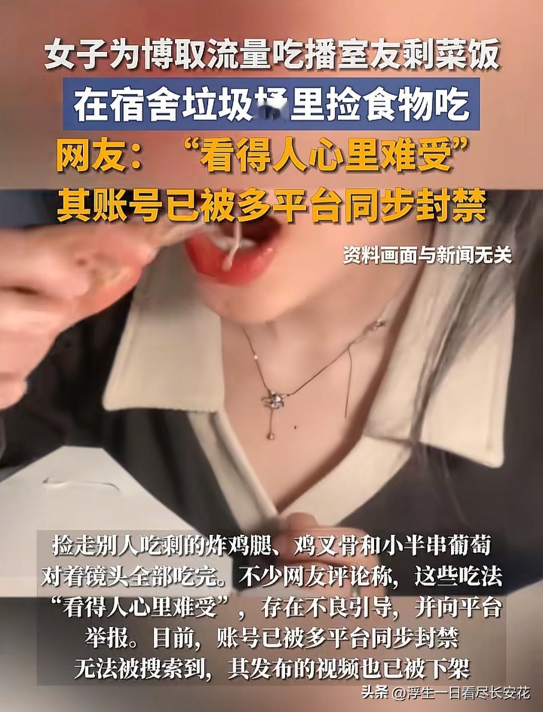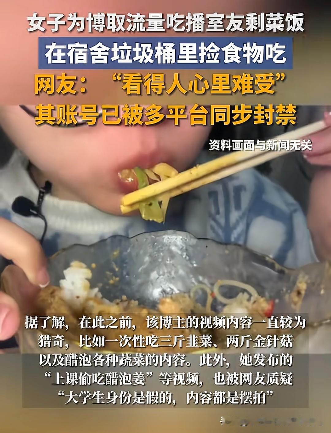 吃室友剩饭女博主被全网彻底封杀了,之前所有膈应人的猎奇视频全部下架。就是那个蔬菜瘾,开水泡几斤蔬菜那个奇葩博主。网友们拍手叫好,这货终于封了,太假了,太令人不适了!为了所谓流量,连底线都不要了。 其实吧,哪有那么多剩菜,哪有那么多真材实料,该博主还自称大学生,大学生哪有那么多的精力和工夫去运营这些,一看就是人设包装出来的,所有都是摆拍,背后都是有公司运营策划的。之前就有媒体曝光吃播吃的火锅底料是道具,是用面包、蛋糕制作而成的。 主播们把观众当成了可以随意愚弄的“傻瓜”,用虚假的表演来博取眼球、赚取流量,这种行为严重伤害了观众的感情,让观众对吃播行业乃至整个网络直播领域的信任大打折扣。当信任崩塌,吃播行业也就失去了立足的根基,最终受损的还是整个行业生态。