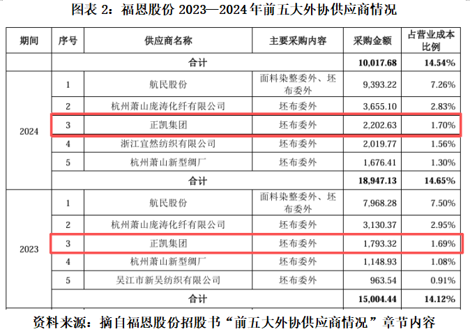 招股书“重大经常性关联交易”部分显示,报告期各期,福恩股份向正凯集团以采购坯布外协加工服务为主,采购金额分别为2035.89万元、1787.29万元、2202.28万元、1418.63万元。