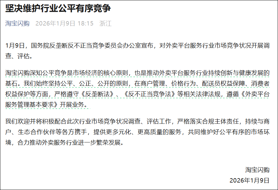 据淘宝闪购消息,1月9日,国务院反垄断反不正当竞争委员会办公室宣布,对外卖平台服务行业市场竞争状况开展调查、评估。