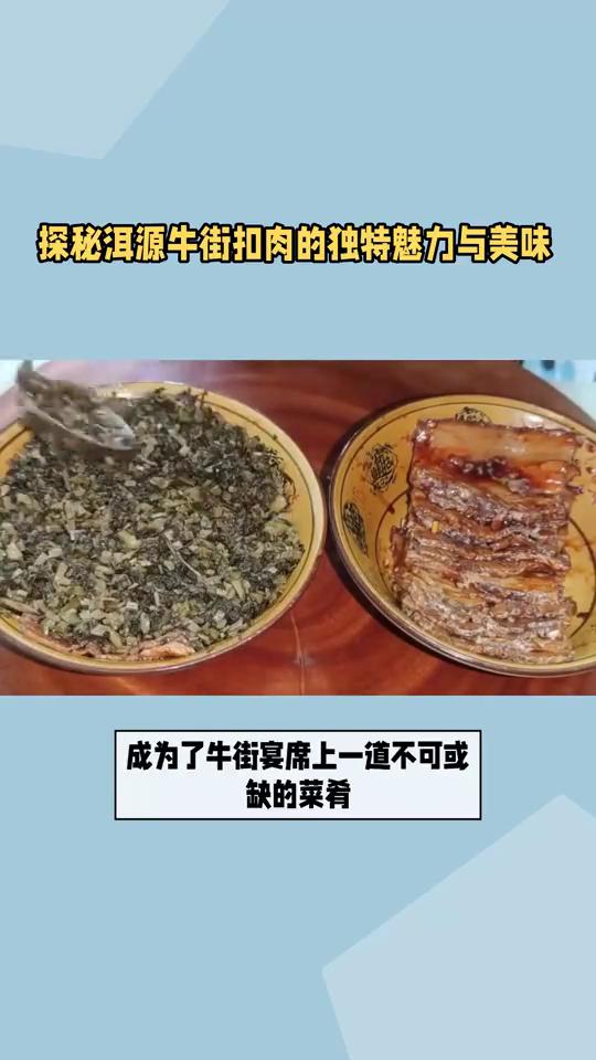 探秘洱源牛街扣肉的独特魅力与美味。 图说洱源牛街扣肉。在牛街扣肉是一道经典的菜肴,有梅干、南瓜等扣肉。扣肉色泽红亮、肥而不腻,入口即化。它既保留了传统扣肉"形"与"烹"的精髓,又在"材"与"味"上进行了创新,成为了牛街宴席上一道不可或缺的菜肴。如果您去牛街,一定不要错过这道美味。