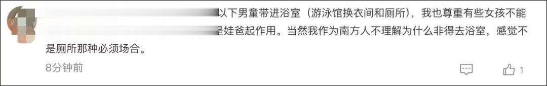 也有网友表示理解,“二岁小孩啥也不懂,肯定不放心交给陌生人带,换位思考理解一下吧”“我个人能接受三岁以下男童带进浴室(游泳馆换衣间和厕所),我也尊重有些女孩不能接受异性在这些地方。”