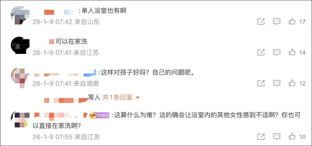 有网友表示,“这算什么为难?这的确会让浴室内的其他女性感到不适啊?你也可以直接在家洗啊?”