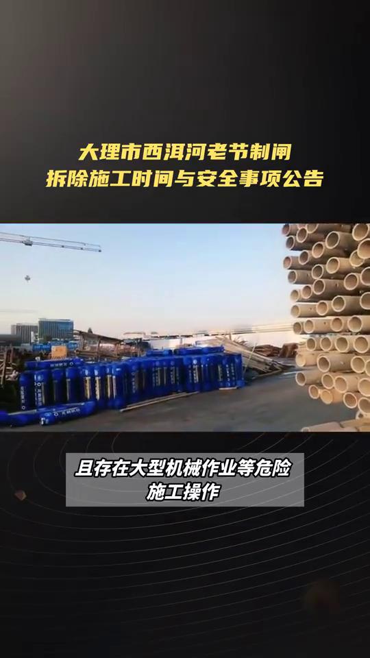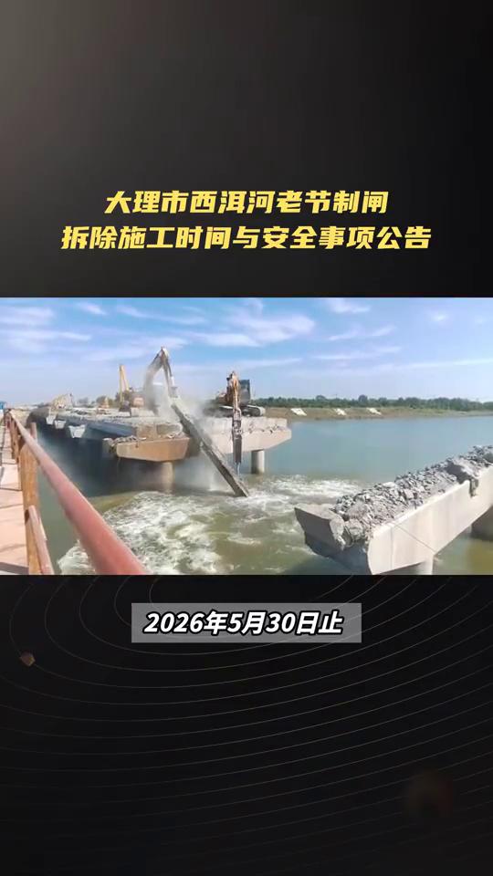 大理市西洱河老节制闸拆除施工时间与安全事项公告。 大理市下关西洱河老节制闸拆除施工公告。西洱河老节制闸拆除施工公告为进一步提升水利设施运行效能,西洱河新节制闸已完成主体施工并投入运行。根据工程整体建设进度安排,现决定对西洱河老节制闸实施拆除施工。为确保施工顺利进行及周边群众生命财产安全,现将有关事项公告如下: ·一、施工时间。 →第一阶段:2026年1月10日起至2026年2月17日止拆除水上建筑。 →第二阶段:2026年4月1日至2026年5月30日止拆除水下建筑,恢复河堤。 ·二、施工区域。老节制闸及周边区域具体范围以施工现场围挡及警示标识划定为准。 ·三、安全注意事项。 →1、施工期间老节制闸周边涉及施工的相关道路将实行封闭管理,禁止非施工车辆及行人进入施工区域。请周边群众提前规划出行路线,绕道通行,避免造成交通拥堵。 →2、施工过程中会产生一定的噪音、尘土,且存在大型机械作业等危险施工操作。为杜绝意外事故发生,敬请广大群众切勿在施工现场附近逗留、围观。 →3、施工期间给周边群众生产生活带来的不便,我们深表歉意,恳请广大群众给予理解与支持,并积极配合施工工作。 大理市西洱河节制闸除险加固工程项目工作专班2026年1月9日。西洱河闸门 下关闸门