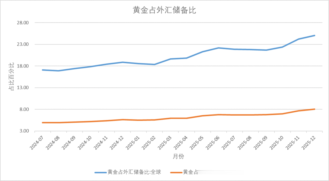 从外汇储备结构看,12月全球黄金在外汇储备中的占比由24.23%提升至25.05%,继续创阶段性新高;同期,中国黄金在外汇储备中的占比由7.68%上升至8.02%,增幅清晰,反映黄金在储备资产中的权重仍在逐步提高。