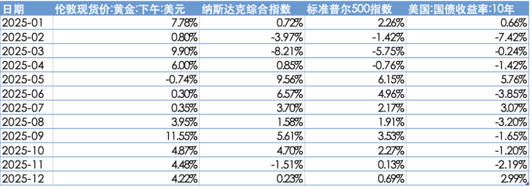 12月全球主要资产整体呈现震荡分化的运行特征。你提供的资产回报数据显示,当月伦敦现货黄金上涨4.22%,明显高于主要权益资产;同期纳斯达克综合指数上涨0.23%、标准普尔500指数上涨0.69%,权益市场整体表现偏弱,风险资产并未形成一致的上行动能。与此同时,美国10年期国债收益率上行2.99%,利率资产维持偏强运行,对风险偏好形成一定约束。
