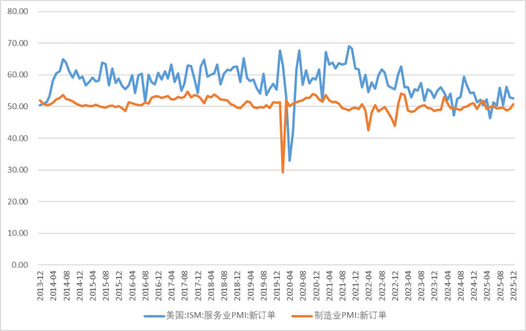 美国方面,ISM制造业PMI新订单指数为47.7%(11月为47.4%),虽小幅回升,但仍处于收缩区间,制造业需求恢复仍显不足;相比之下,ISM服务业PMI新订单指数维持在52.6%,虽较11月略有回落,但继续处于扩张区间,显示服务业需求仍对美国整体经济形成支撑。