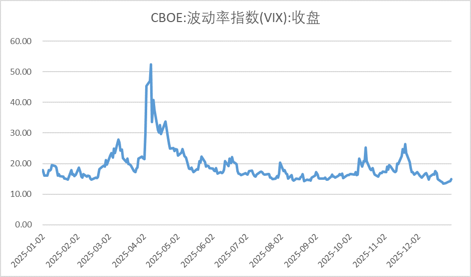 从波动率指标看,CBOE波动率指数(VIX)月内由16.35%小幅回升至17%附近,随后回落至14.95%,整体仍处于年内偏低区间,显示市场波动水平有限,风险情绪以短期扰动为主,并未明显恶化。