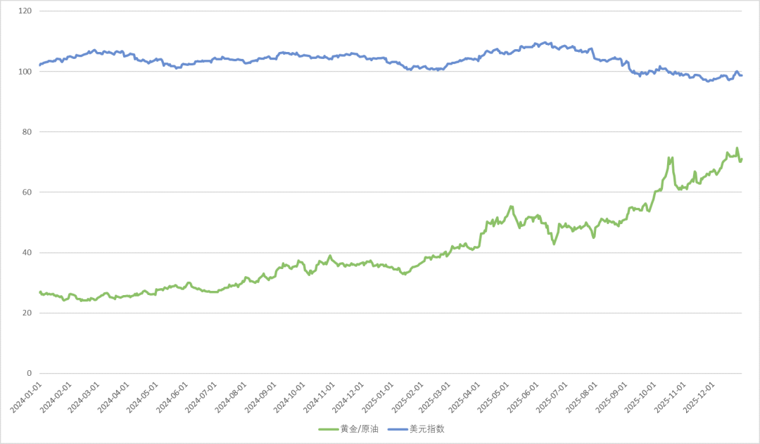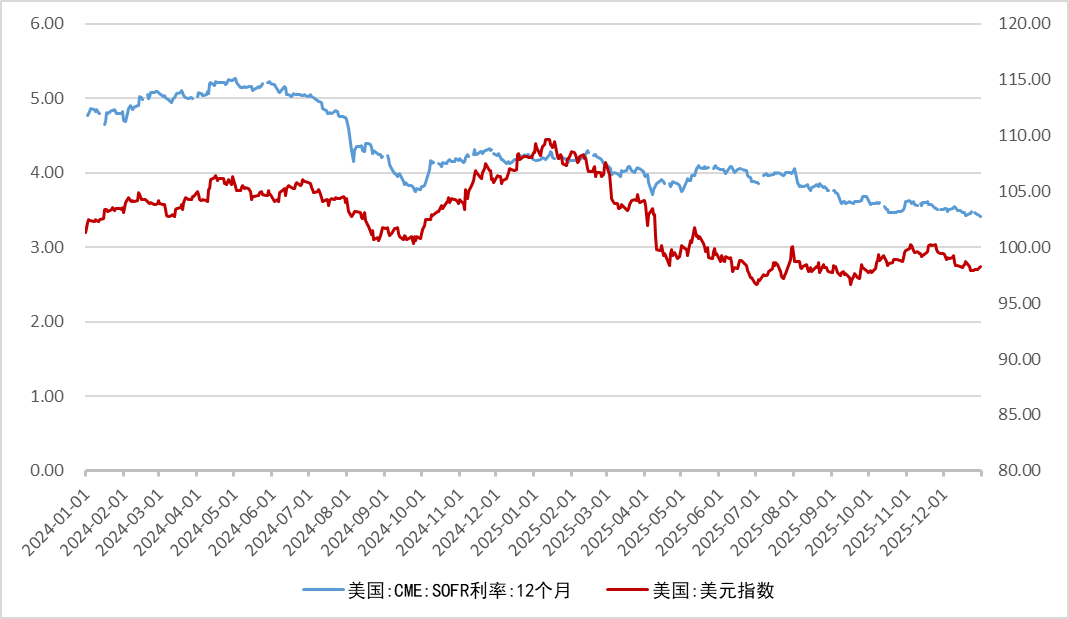 美元指数方面,12月整体运行于96–100区间,仅在12月26日短暂突破100,其余时间均处于100以下震荡,对大宗商品估值未形成持续性压制。美元偏弱震荡的环境,为贵金属与工业属性品种的相对表现提供了中性偏有利的外部条件。