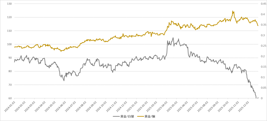 综合来看,12月贵金属内部估值变化主要体现在金银结构的显著分化以及黄金相对工业金属估值的温和回落:白银在工业需求、资金流入与价格弹性驱动下明显跑赢黄金;而黄金相对铜、原油等品种的估值关系以缓慢调整为主,更多体现为高位整理与配置属性并存的状态。板块整体仍延续“黄金定盘、工业属性偏强”的结构特征。