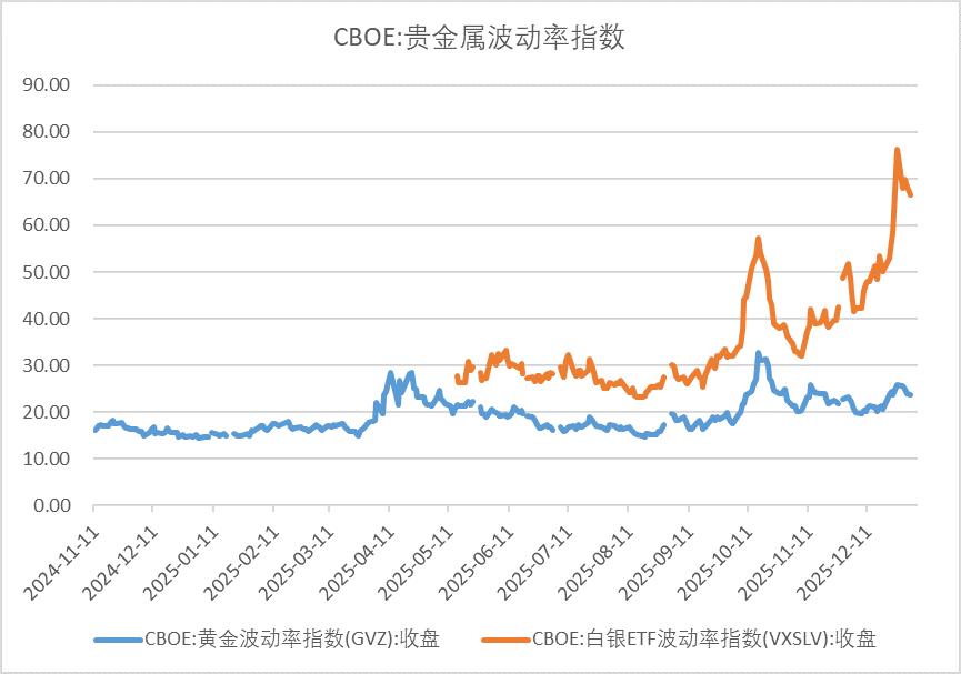 12月贵金属波动率整体维持高位运行,但月内节奏呈现出清晰的阶段性变化。月初至中旬波动率水平相对平稳,12月下旬在价格上行与交易活跃度提升的背景下出现集中抬升,随后于月底回落并趋于稳定。
