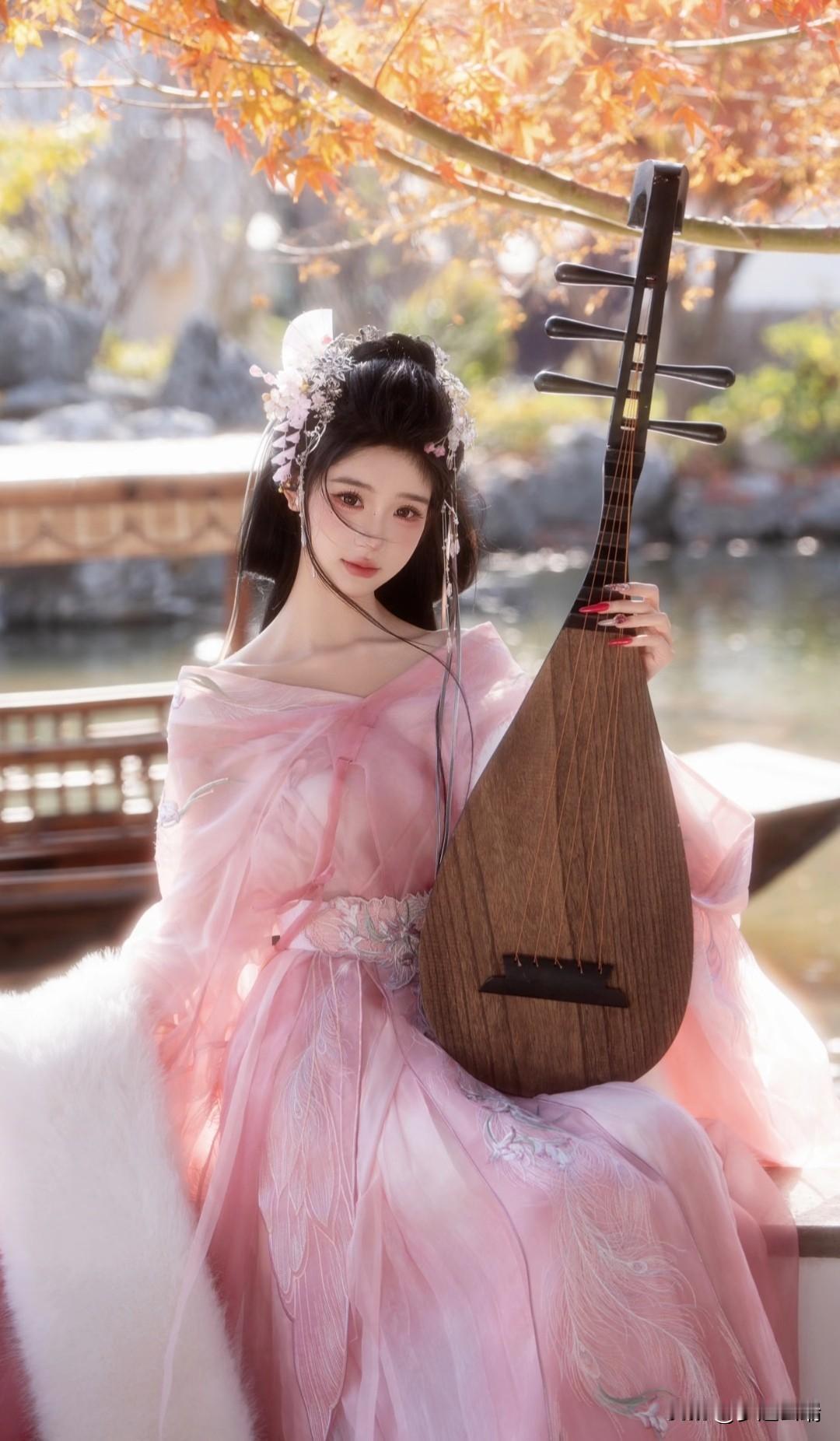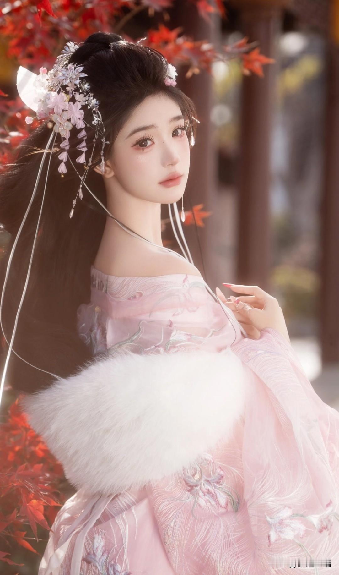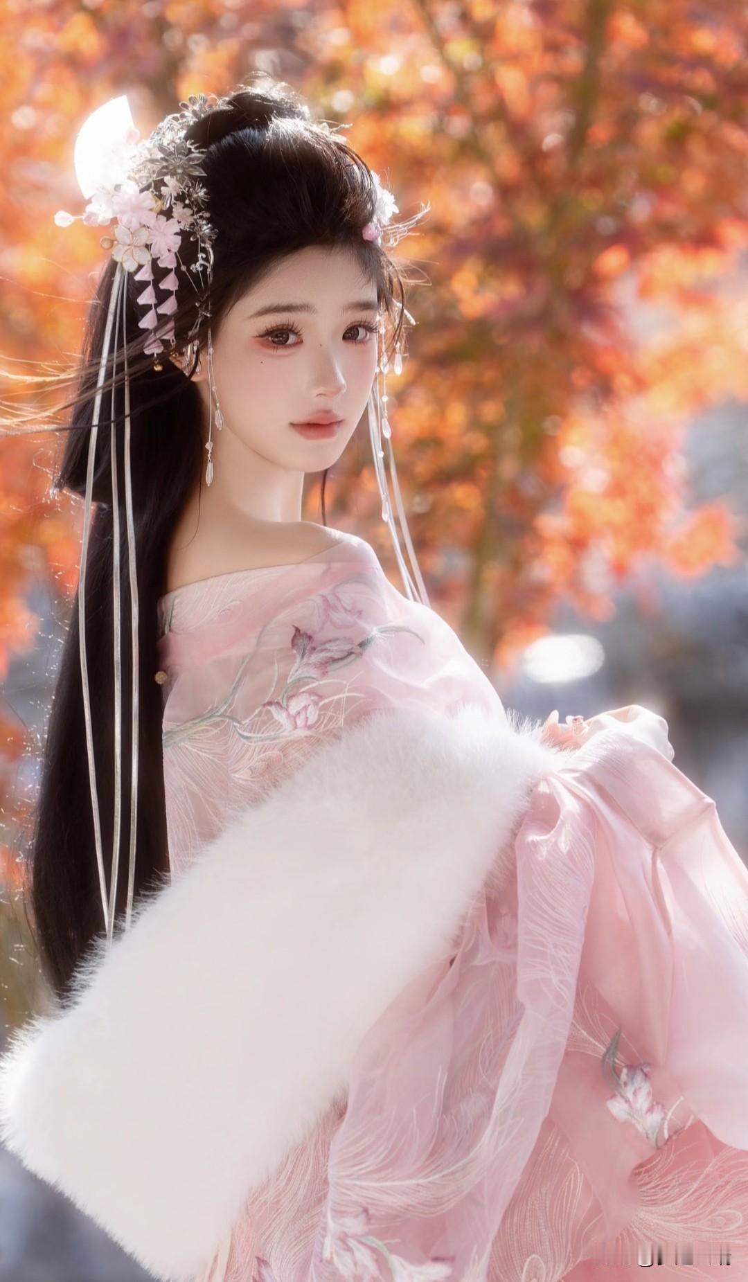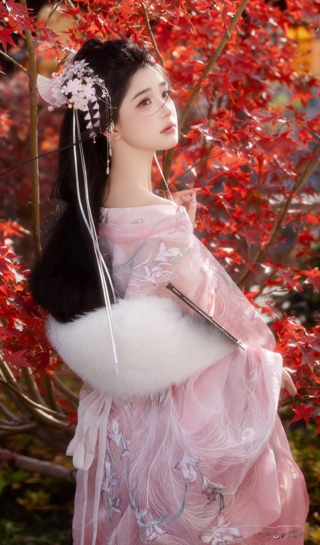 秋日红叶下的古典美人,手持团扇,宛如画中仙子。