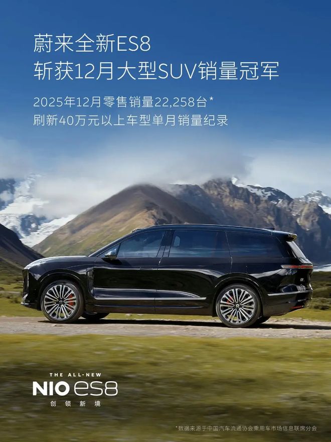电动知家消息,1月10日,据中国汽车流通协会乘用车市场信息联席分会发布的最新数据显示,2025年12月,蔚来全新ES8零售销量达22258台,一举斩获大型SUV、大三排SUV市场以及40万元以上车型三料销量冠军。这一成绩标志着中国市场上纯电车型首次在大型SUV领域超越传统燃油车,成为新的销量王者。尤为引人注目的是,全新ES8自2025年9月21日开启交付后,仅用100天便完成40000台交付里程碑,创下国内40万元以上车型交付“破四万”的最快纪录。