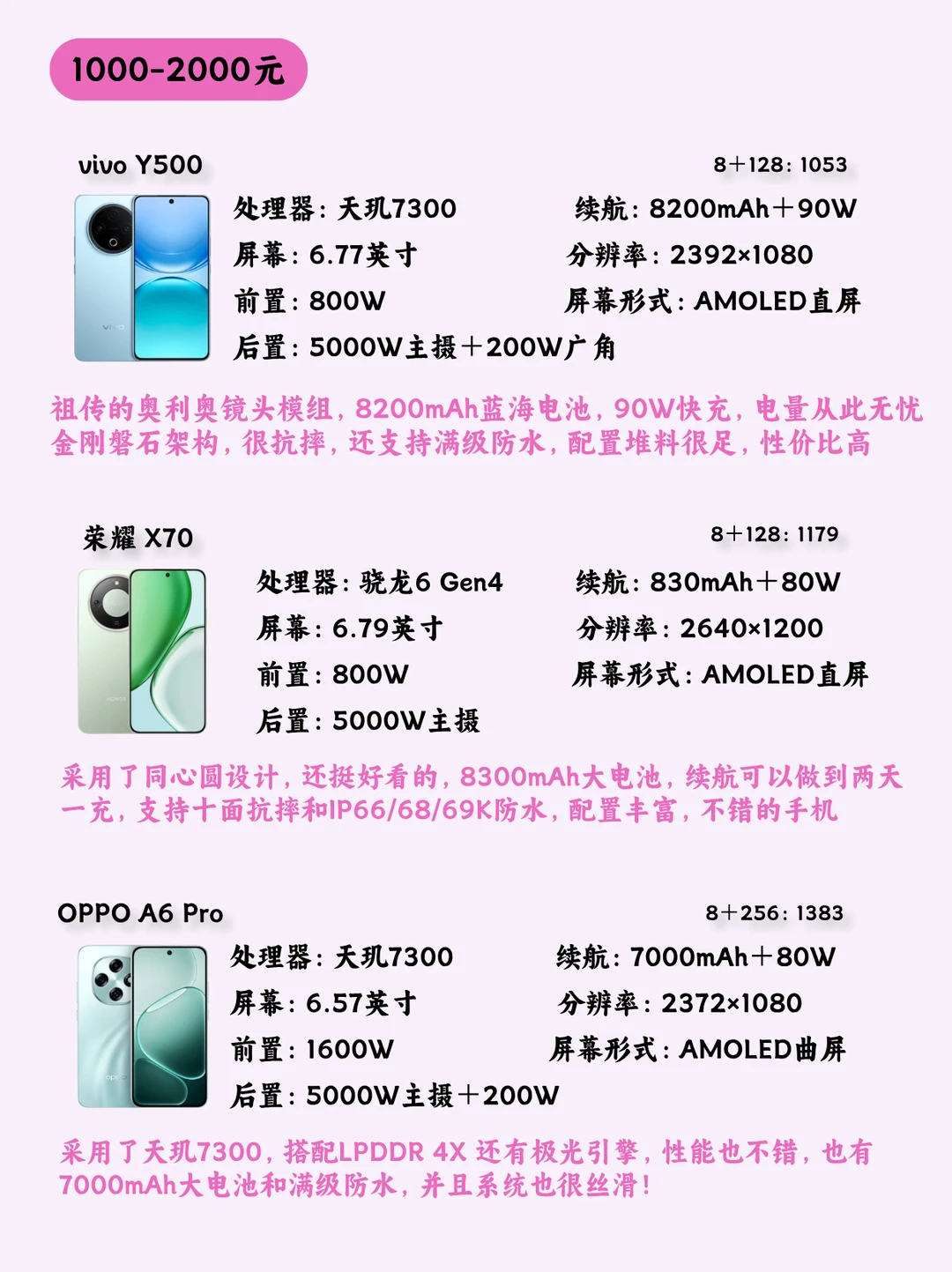 vivo Y500、荣耀X70、OPPO A6 Pro