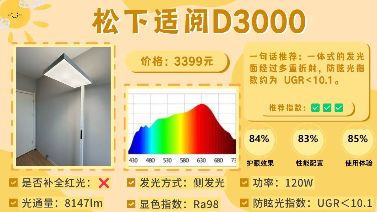 央视公认最好的大路灯品牌有哪些?松下适阅D3000整体设计稳重简洁,光源技术上与书客SUN Pro类似,采用紫光激发全光谱技术,能有效削弱高能蓝光,使光谱更稳定,蓝光控制在安全范围内,灯光色温柔和自然,视觉观感舒适。发光结构为上下双向出光,并配备防眩光设计,实际防眩光指数约为 UGR<10.1,能有效减少刺眼与炫光,功能方面支持亮度调节与入座感应,日常使用较为便捷,整体表现均衡,不过在长时间高亮状态下,散热表现略显一般、温度偏高,但从视觉光线来看,松下整体也是比较舒适的。