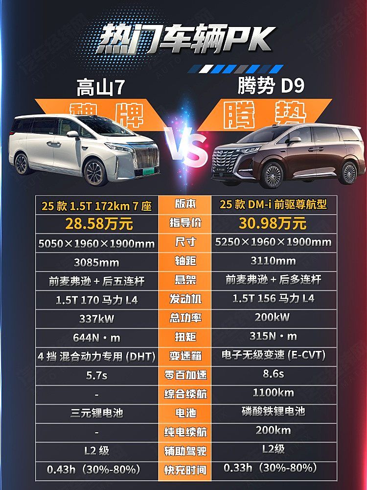 魏牌高山 7 像 “家用 MPV 里的性能派”,把加速和智能驾驶玩出了新花样;腾势 D9 更像 “MPV 界的全能选手”,用大空间和成熟混动稳住了家用基本盘。28 万到 31 万的选择,本质是选 “更符合你生活场景的便利”。