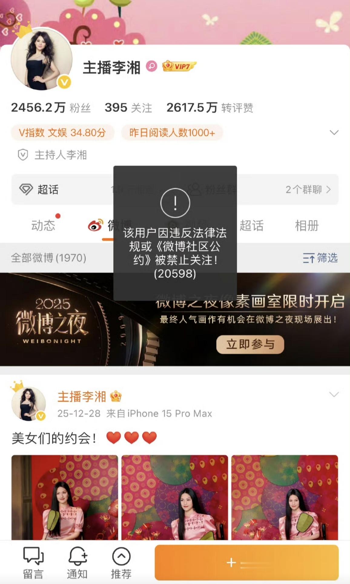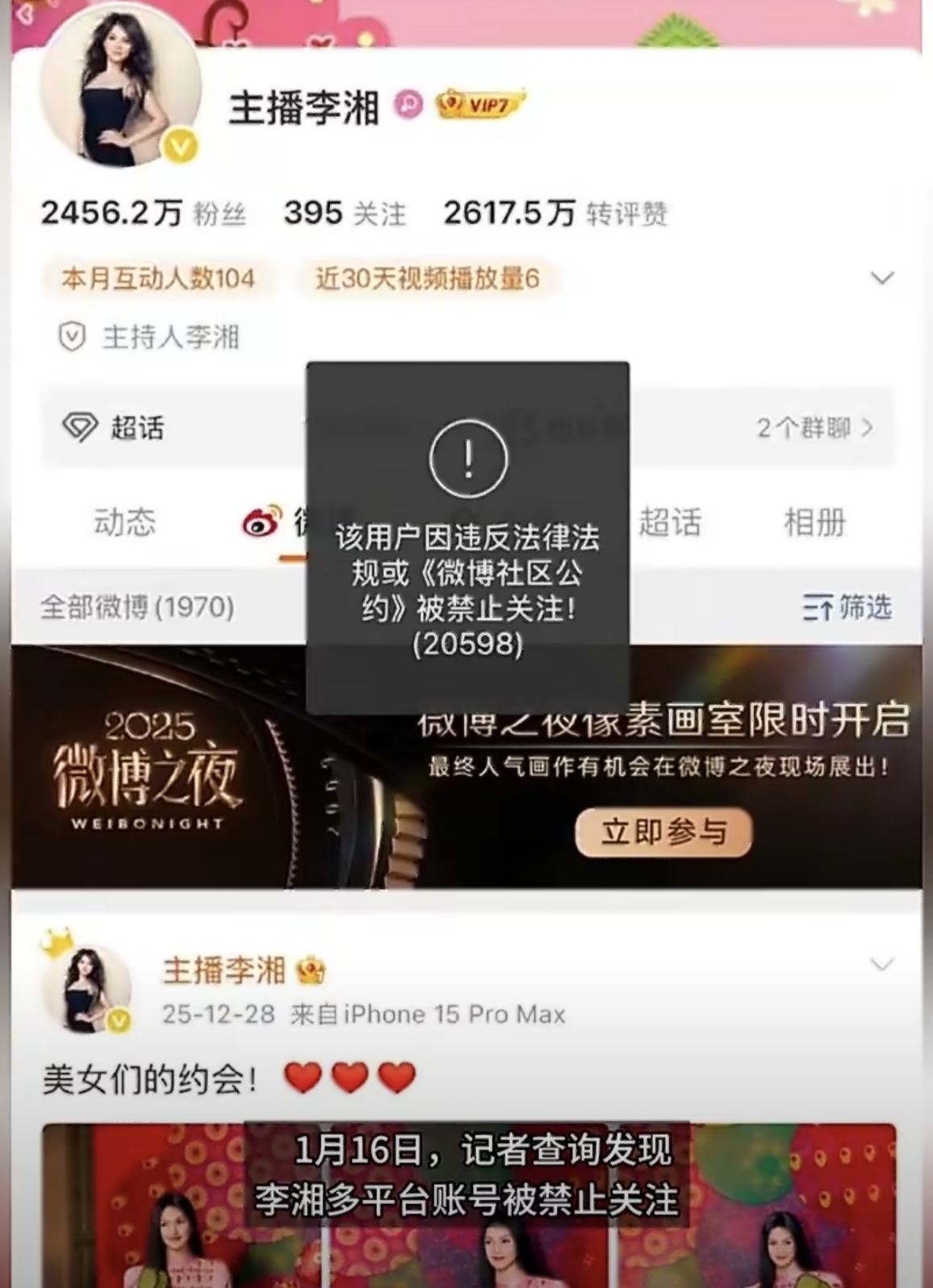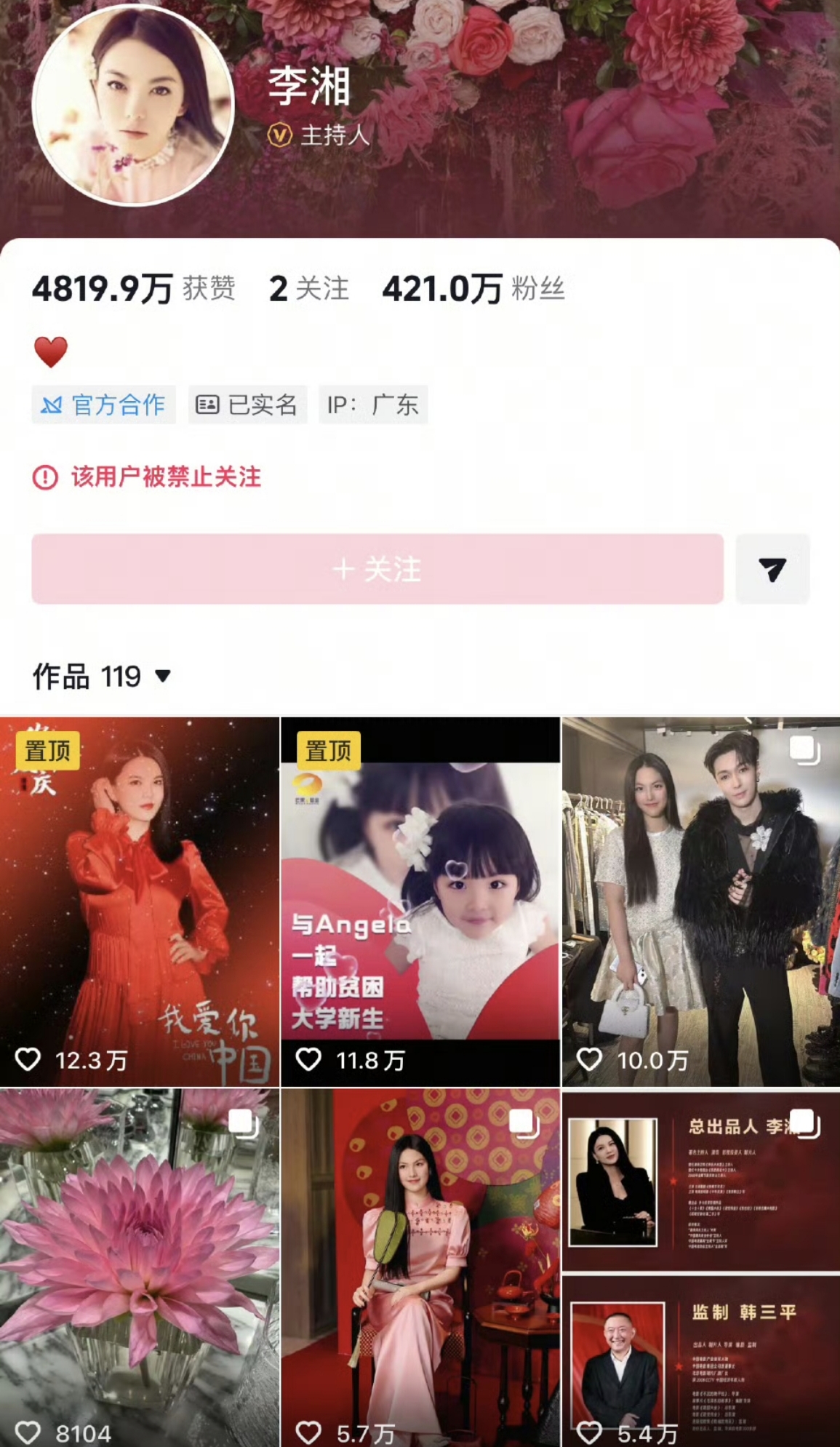 1月16日清晨,微博、抖音、小红书像约好了一样,齐刷刷给李湘贴上封条——“该用户被禁止关注”。一句话翻译:想点+1?门都没有!两千多万粉瞬间变“橱窗模特”,只能远观不能近玩,活脱脱大型“社死”现场。