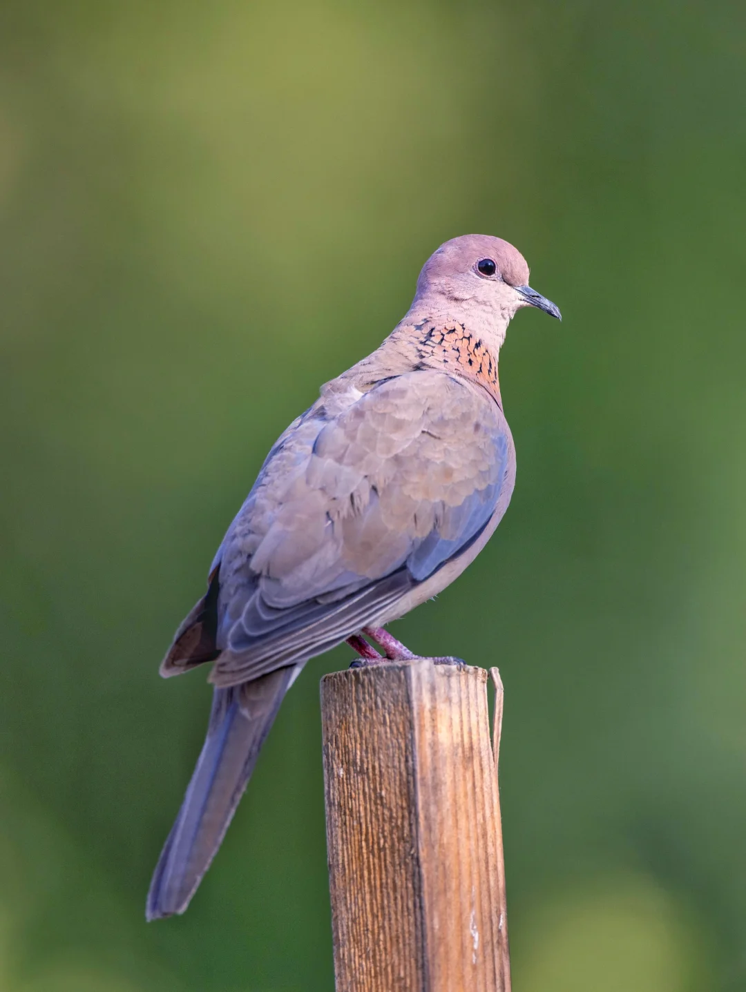 原创拍摄于2025.05 棕斑鸠,Laughing Dove,鸽形目鸠鸽科珠颈斑鸠属。一种分布在旧世界各地,却在我国很少见的鸽鸽,只有在新疆有一些繁殖。 棕斑鸠和我们常见的珠颈斑鸠有一点像,毕竟是同属,它们的头颈是漂亮的粉色,颈部两侧是漂亮的展示羽,每根羽基部黑色,顶部铜金色。翼羽蓝灰色也是点缀。 棕斑鸠的英文名字是笑鸽,它们的叫声确实像重复的笑声。 棕斑鸠在我国新疆之前一度消失,现在又重新出现,数量也在增加,毕竟是珠颈斑鸠的亲戚,种群恢复还是有信心。