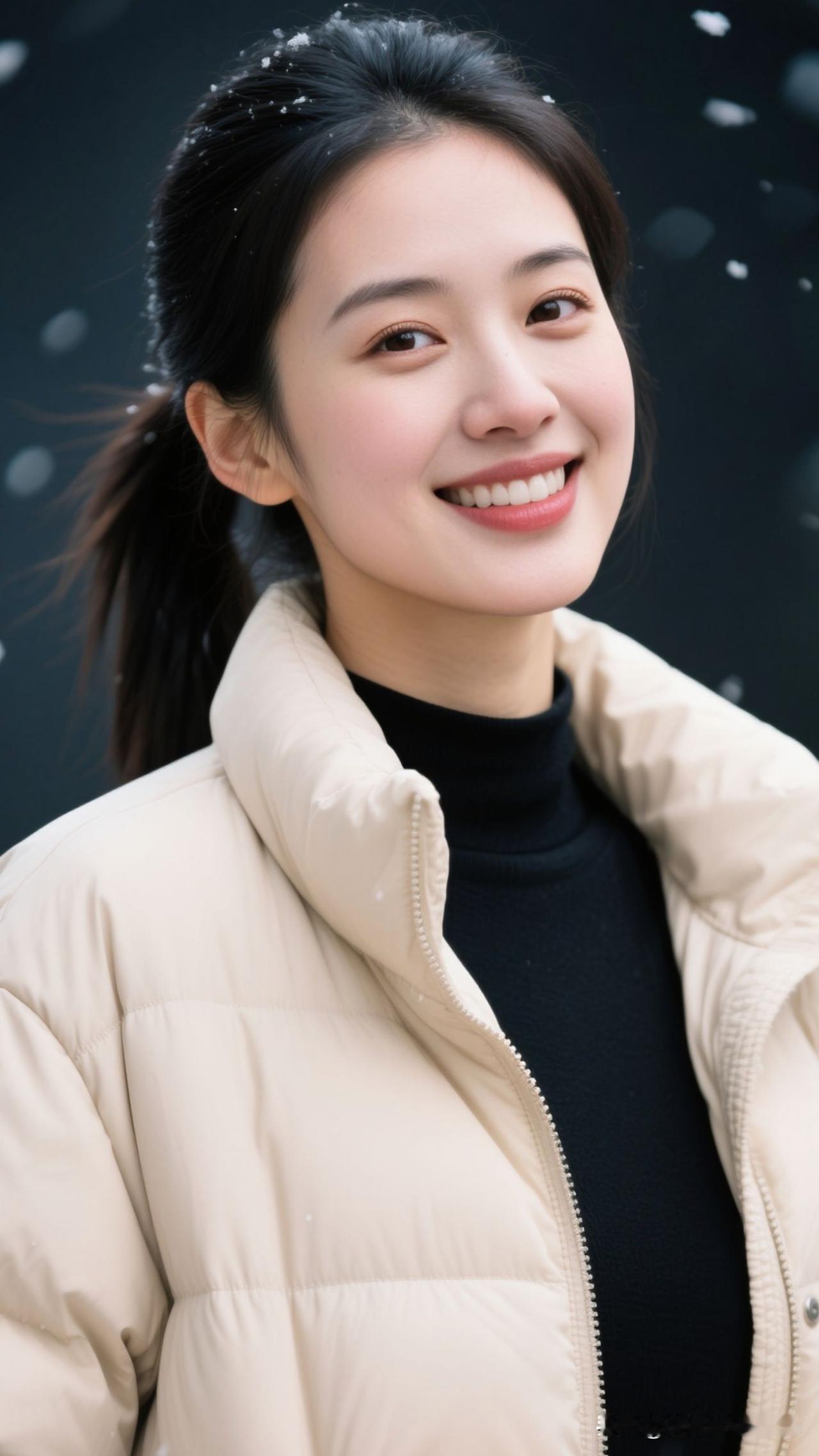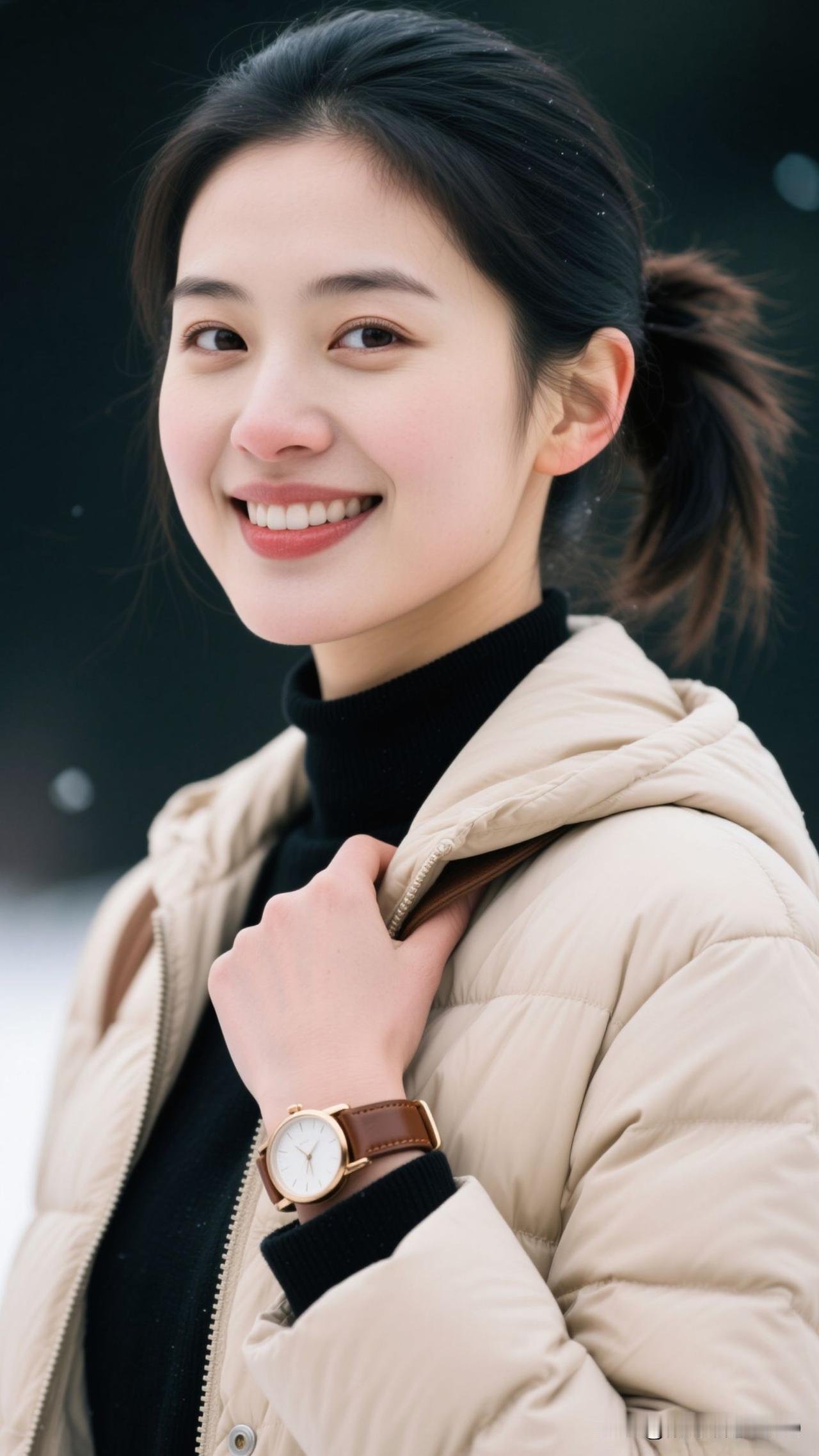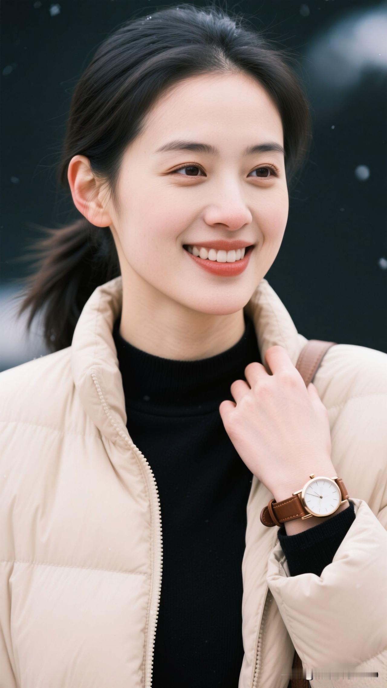 冬夜为笺,米白是晕开的奶霜,黑衫是凝住的星,腕表曳着光,一笑便盛了满室浪漫。雪夜