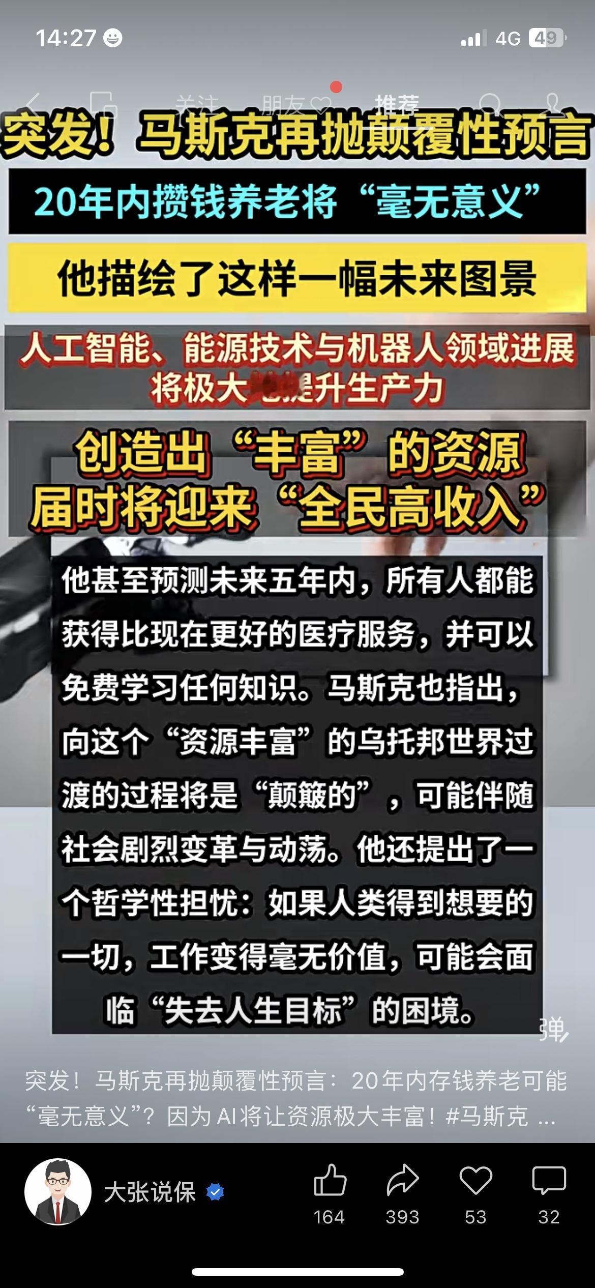 马斯克放狠话:20年内攒钱养老纯属白忙活? 他说AI和机器人会让资源直接爆仓,未来全民都能拿高收入,可现在咱们普通人还在为房贷、养老钱抠搜过日子。这预言听着跟画大饼似的,真要是信了停了储蓄,未来没兑现岂不是要喝西北风? 你觉得现在攒钱养老还靠谱吗?马斯克预言 养老规划 AI发展马斯克