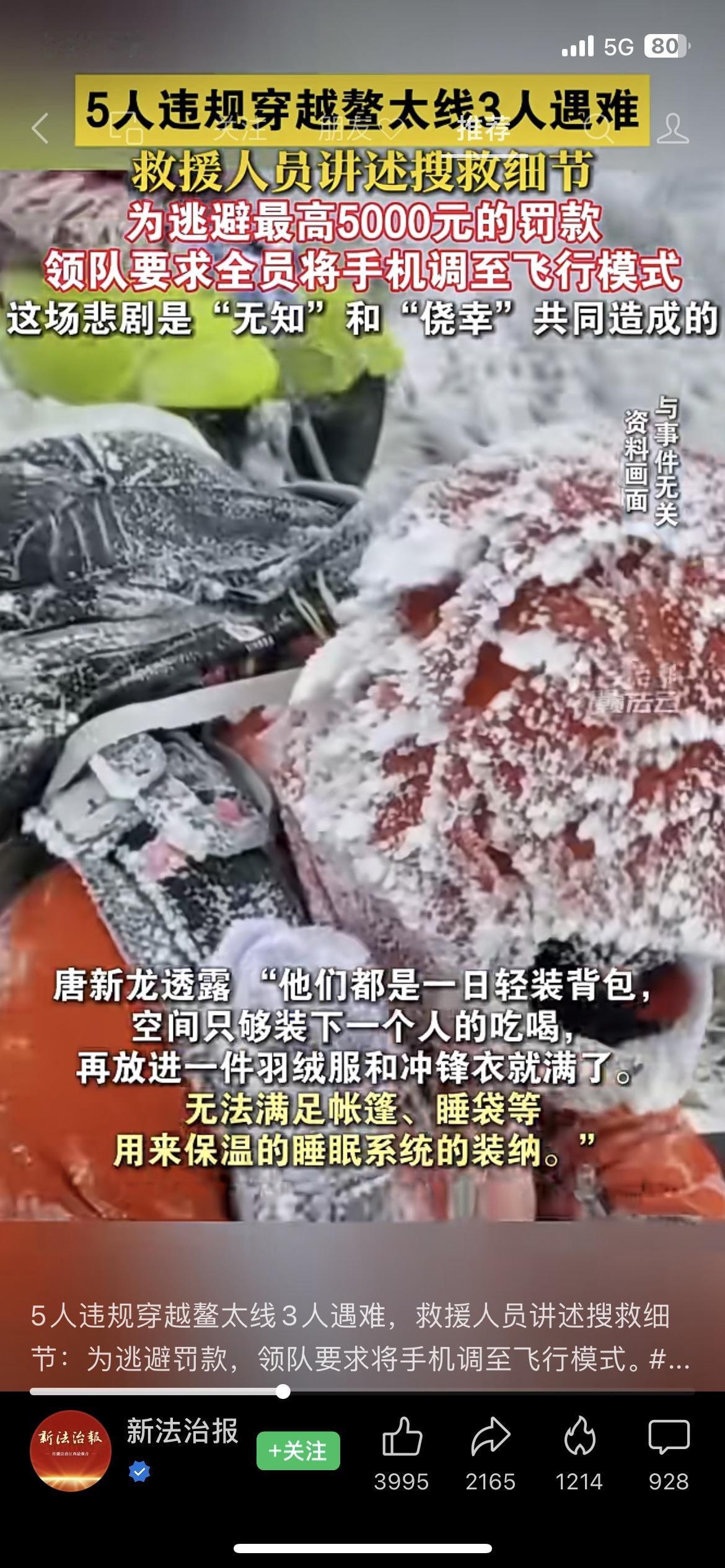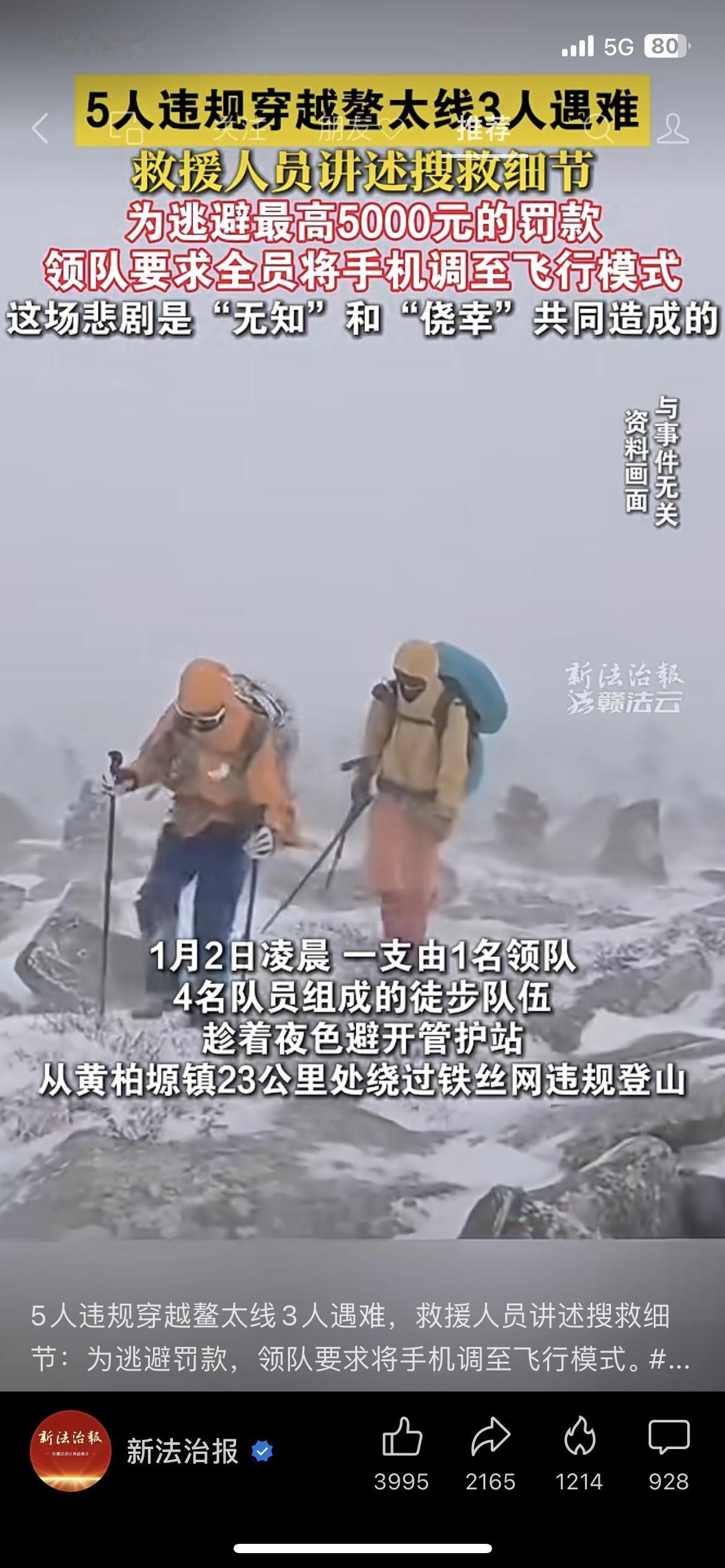 为避5000元罚款,鳌太线穿越队关手机酿悲剧! 5人违规穿越,3人遇难,领队的侥幸心理害了所有人。鳌太线本就明令禁穿,无视规则的冒险,最终只会付出生命代价。 你怎么看户外违规穿越的行为?鳌太线悲剧 户外安全鳌太线禁令 鳌太线救援