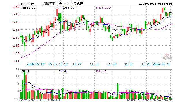 1月13日,A50ETF龙头(512240)开盘涨0.60%,报1.183元。A50ETF龙头(512240)重仓股方面,宁德时代开盘涨1.26%,贵州茅台涨0.25%,中国平安涨0.37%,招商银行涨0.19%,紫金矿业涨0.38%,美的集团跌0.92%,长江电力涨0.18%,立讯精密涨0.40%,恒瑞医药涨0.70%,比亚迪涨1.57%。