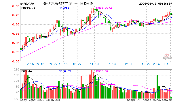 1月13日,光伏龙头ETF广发(560980)开盘跌0.39%,报0.762元。光伏龙头ETF广发(560980)重仓股方面,阳光电源开盘跌0.17%,特变电工跌0.08%,TCL科技跌0.21%,正泰电器涨0.00%,晶盛机电跌2.25%,德业股份跌0.60%,捷佳伟创跌1.94%,科华数据跌0.60%,锦浪科技涨0.12%,阿特斯跌0.44%。